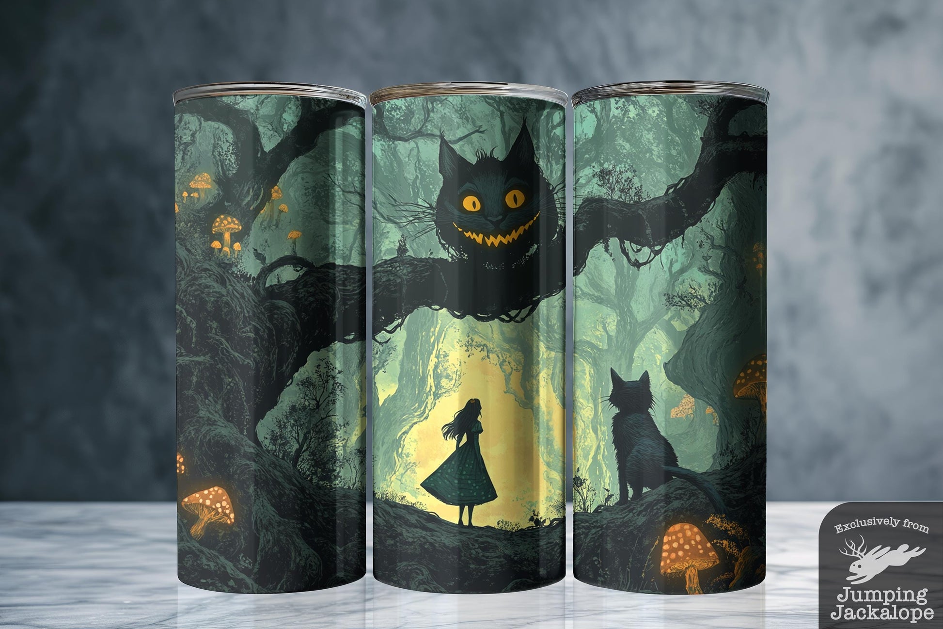 In a shadowed forest where nothing is quite what it seems, Alice stands face-to-face with the Cheshire Cat. This 20oz tumbler captures their unsettling meeting in richly detailed linework, vintage color tones, and glowing mushroom accents—an exclusive design only from Jumping Jackalope.