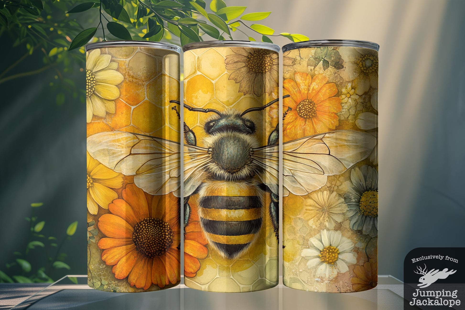 Buzzing with color and joy, this cheerful design features a realistic bee amidst golden daisies and warm orange blossoms. A bright honeycomb backdrop adds a sunny glow to this charming tumbler—perfect for bee lovers and lovers of all things blooming.