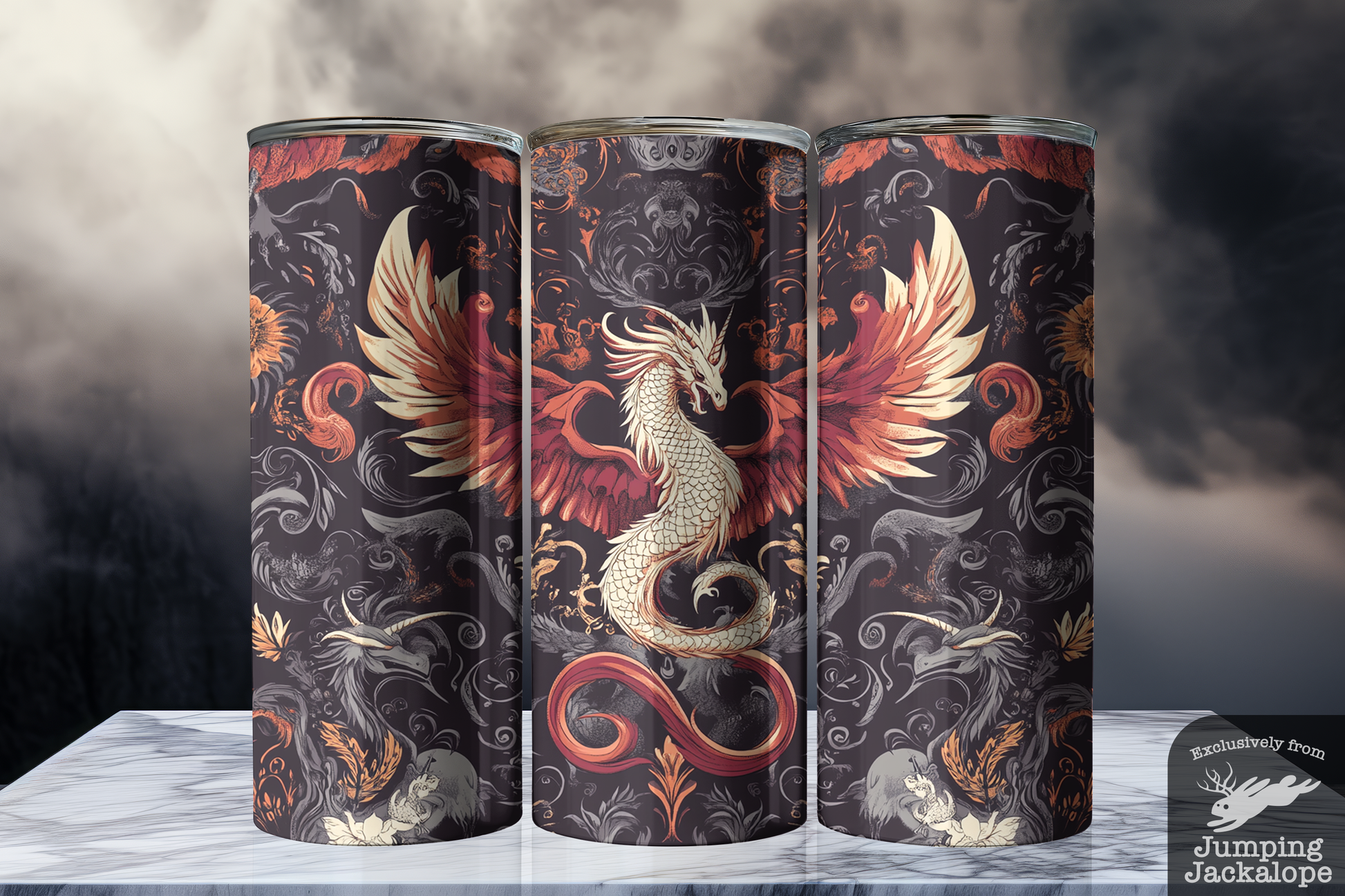 Celestial Flame Dragon Tumbler – 20oz Fiery Winged Serpent | Gothic Fantasy Art Drinkware