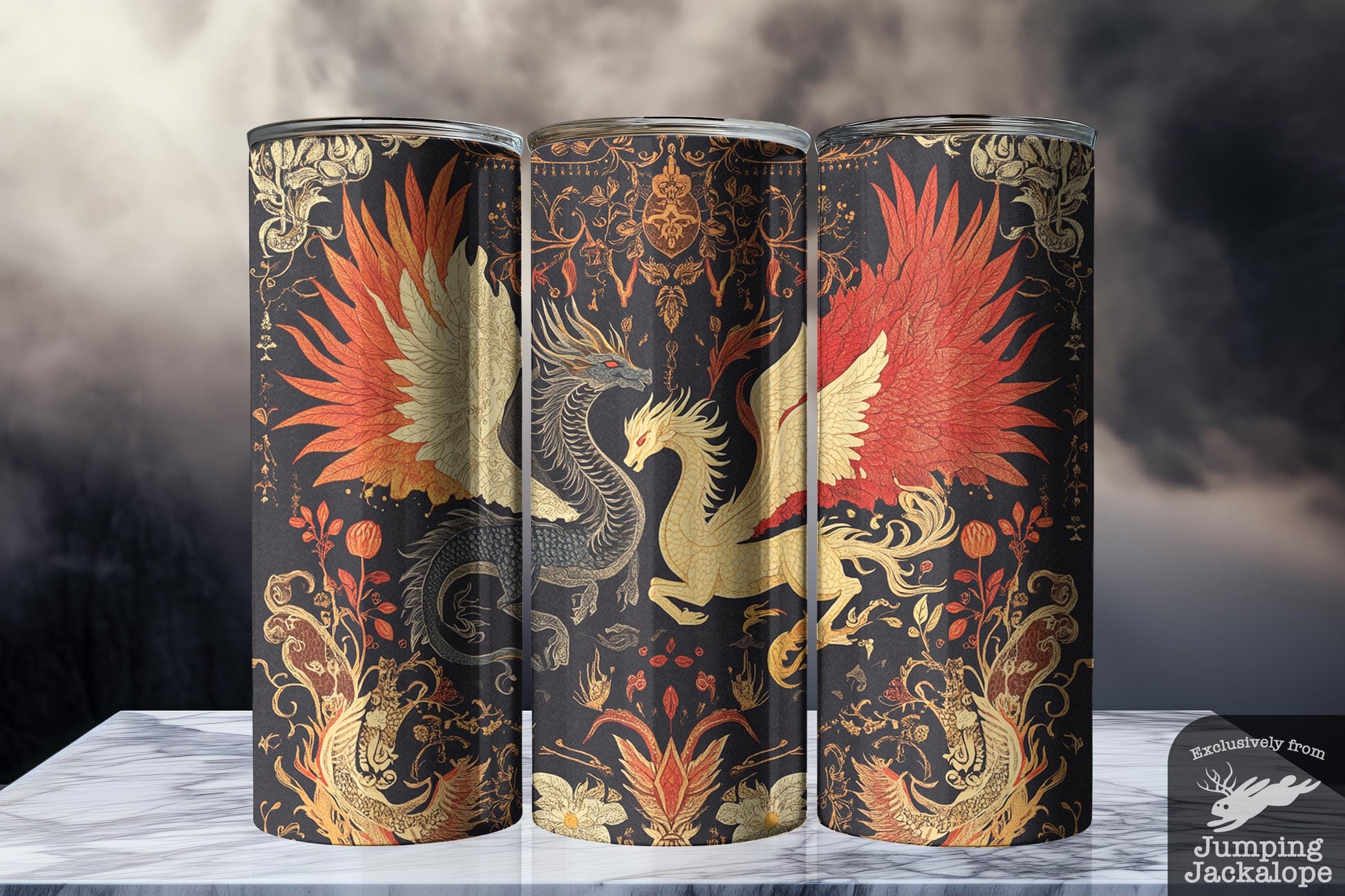Ignite your imagination with this exclusive 20oz tumbler featuring a breathtaking battle between the phoenix and the dragon. Locked in a swirling clash of fire and fury, these legendary creatures are illustrated in exquisite linework and richly textured detail. Vibrant ember reds, molten golds, and inky black tones swirl through the design like smoke across the stars, creating a powerful contrast of rebirth and rage.