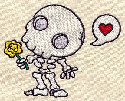 Guest artist Lisa Jonte drew this charmingly cute skeleton -- ready to proclaim his love!
