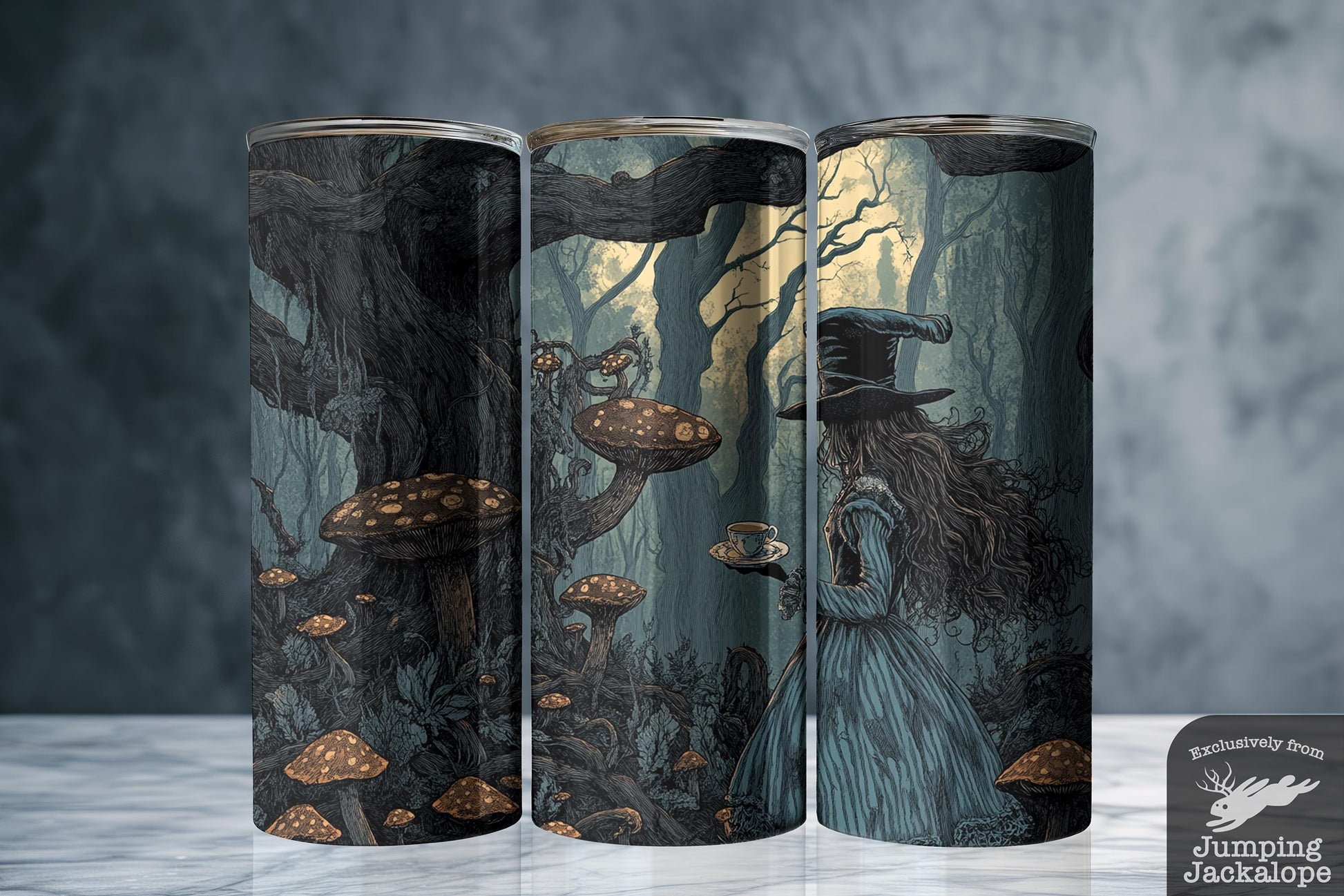 Dark Alice Tea Tumbler – 20oz Sublimated Cup | Mushroom Forest Wonderland Scene | Customizable Gothic Fantasy Gift