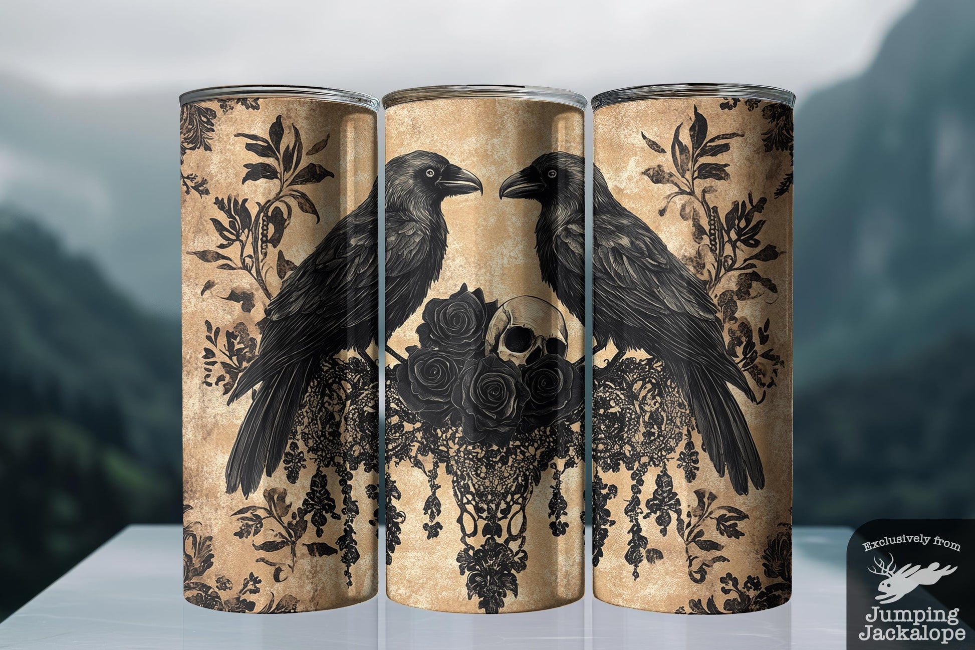 Two stoic ravens face each other atop a skull and black rose arrangement, framed by dripping lace and gothic foliage. Rendered in rich sepia tones, this 20oz tumbler brings old-world horror and vintage flair to your daily sip. A must-have for fans of dark literature, haunted romance, and gothic style.