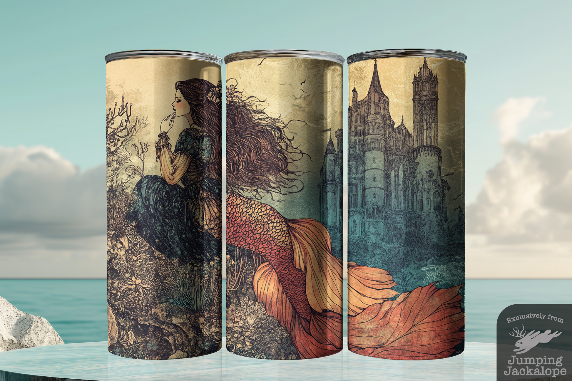 Immerse yourself in the mysterious calm of the deep sea. This 20oz tumbler features an ethereal mermaid surrounded by sea flora and glowing fish, all captured in dark, moody tones. The design fuses botanical illustration with mythical elegance, perfect for dreamers and lovers of underwater legends.