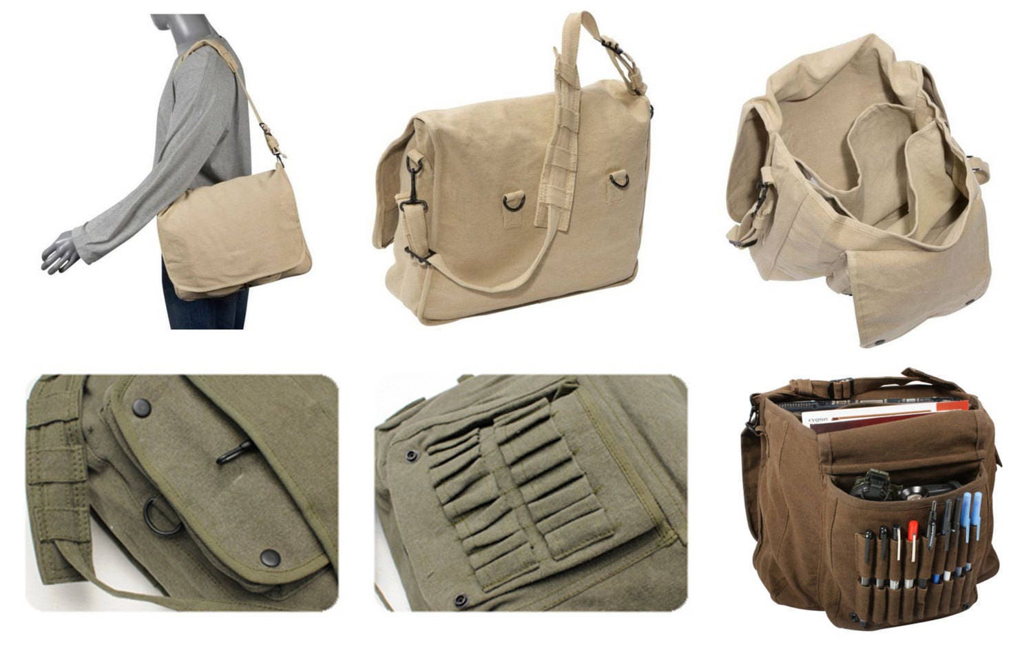 Vintage Canvas Messenger Bag offers classic styling and functionality and features 3 inner compartments great for storage of books or gear, 1 outer compartment w/ snaps and a fully adjustable shoulder strap.