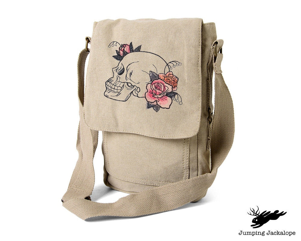 Dire Blooms - Skull Embroidered Canvas Tech, Tablet, iPad, Kindle, Fire, Camera Bag
