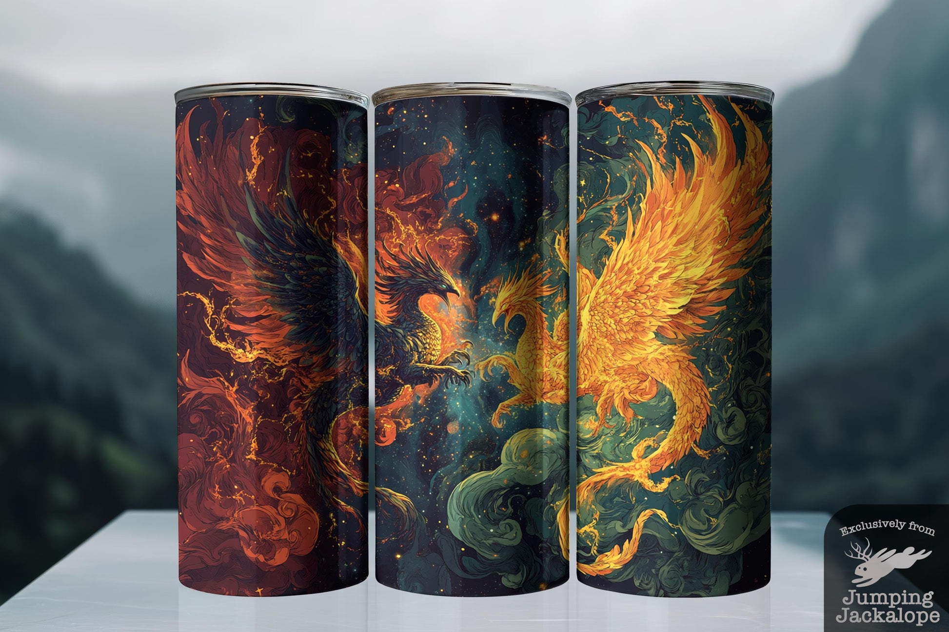 Dragon vs. Phoenix Tumbler – 20oz Celestial Battle Fantasy Cup | Fiery Mythical Art Drinkware