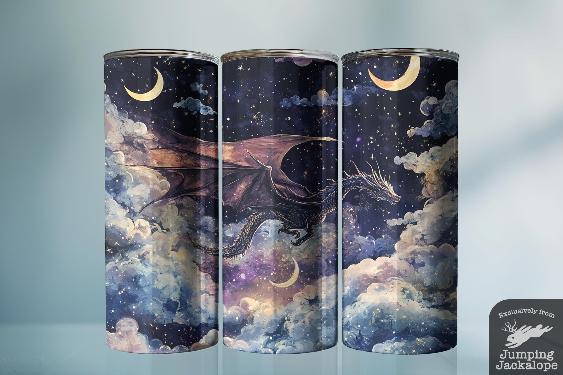 This 20oz tumbler captures the beauty of a dragon gliding through a galaxy of stardust and clouds. Hues of deep plum, gold, and soft midnight swirl around the dragon’s elegant silhouette, while crescent moons glow in the distance. It’s a magical moment frozen in time—powerful, peaceful, and utterly enchanting.