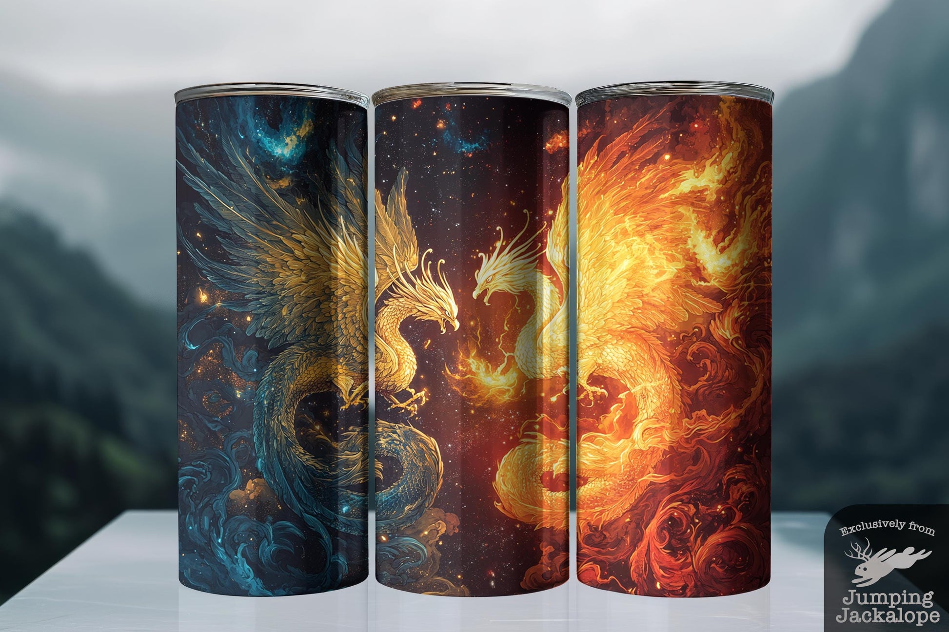 Embers of Legend Tumbler – Phoenix and Dragon Battle in Firelit Sky | 20oz Fantasy Epic Drinkware