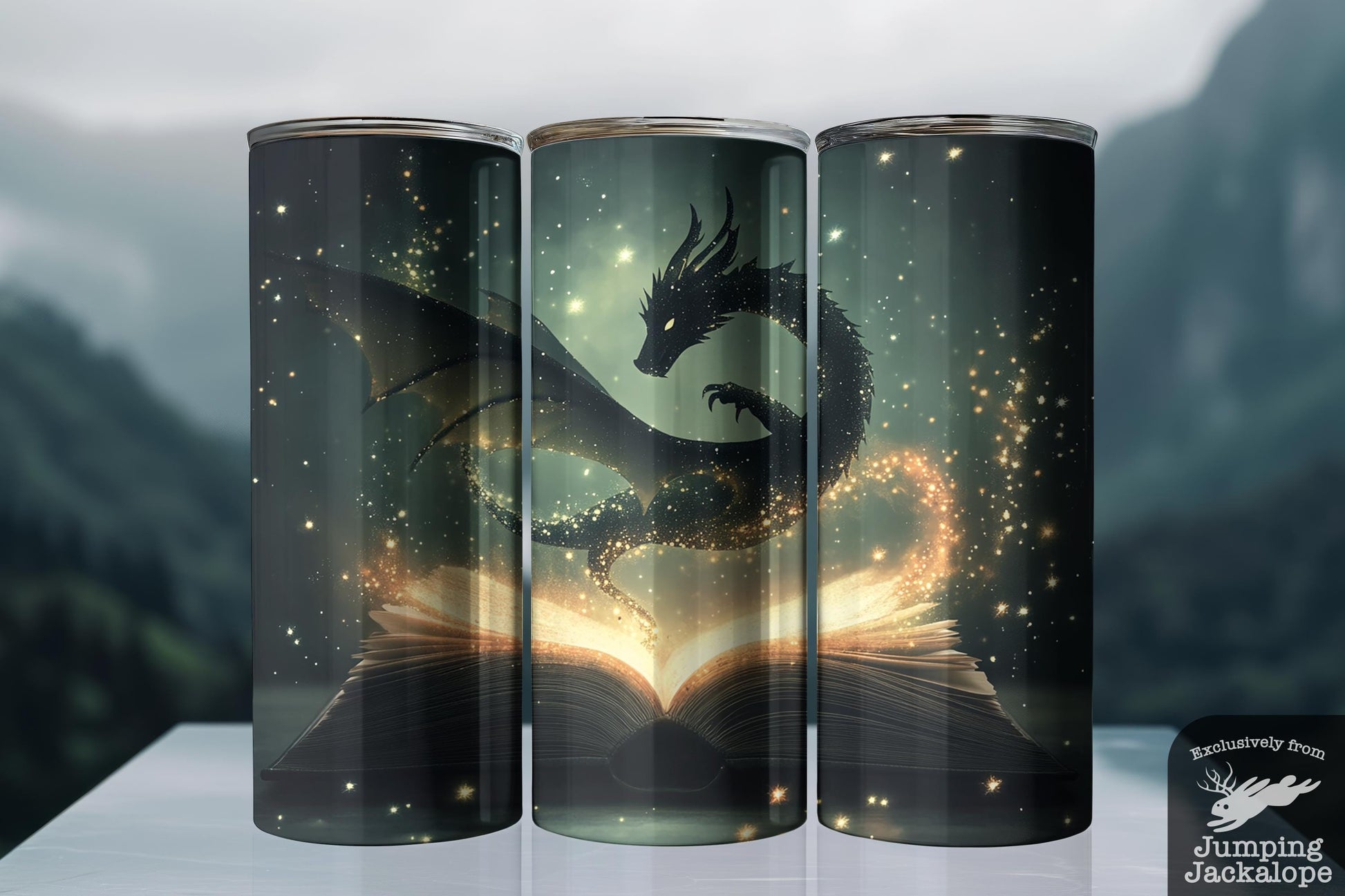A luminous black dragon rises from the pages of a magical tome, its silhouette glimmering with golden stardust and arcane power. This 20oz tumbler captures the exact moment a spell becomes reality—radiating with energy, wonder, and mythic allure. A captivating gift for readers, dreamers, and fantasy fanatics who believe in the magic between pages.
