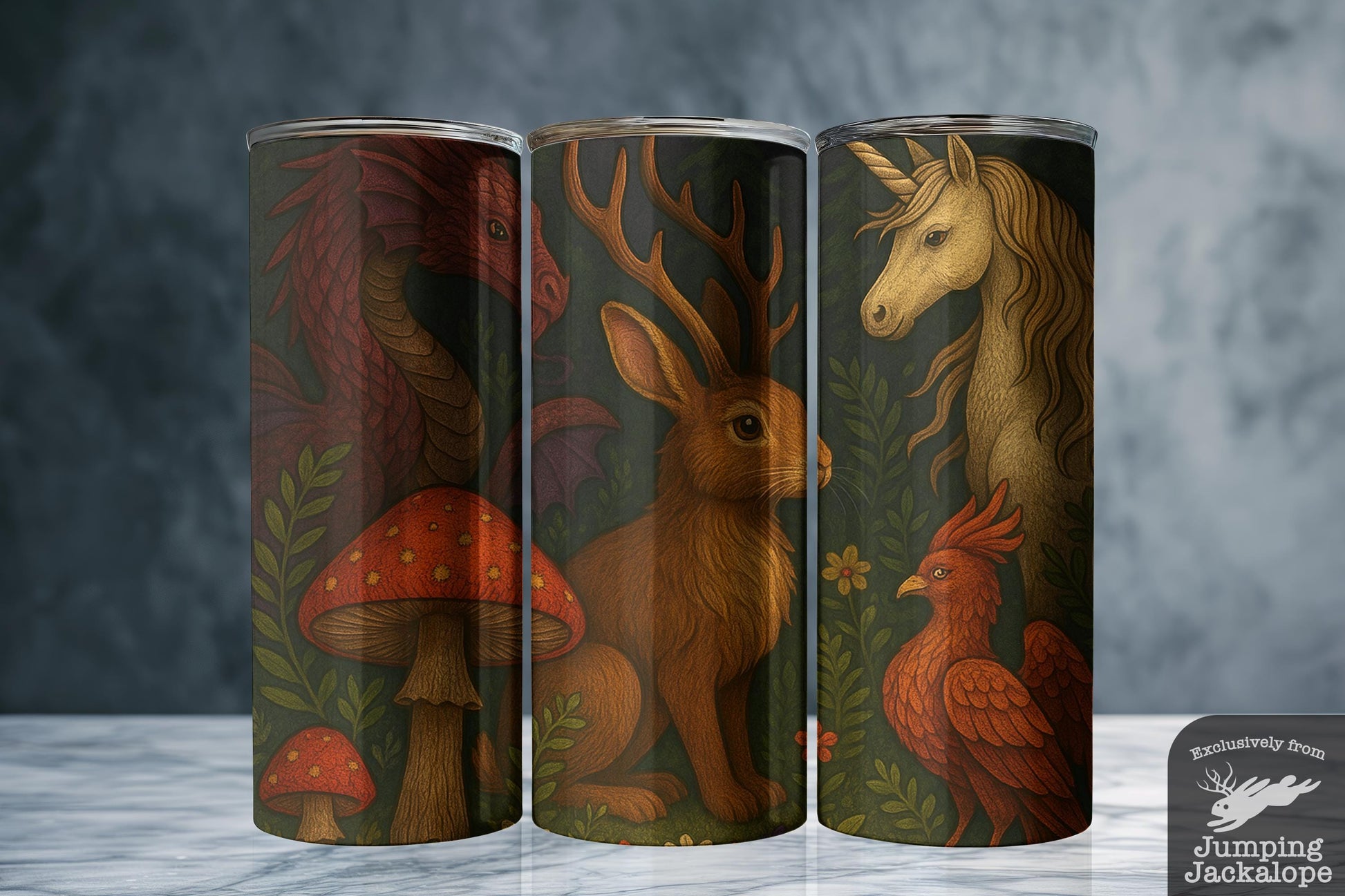 Enchanted Woodland Creatures Tumbler – Dragon, Jackalope, Unicorn & Phoenix