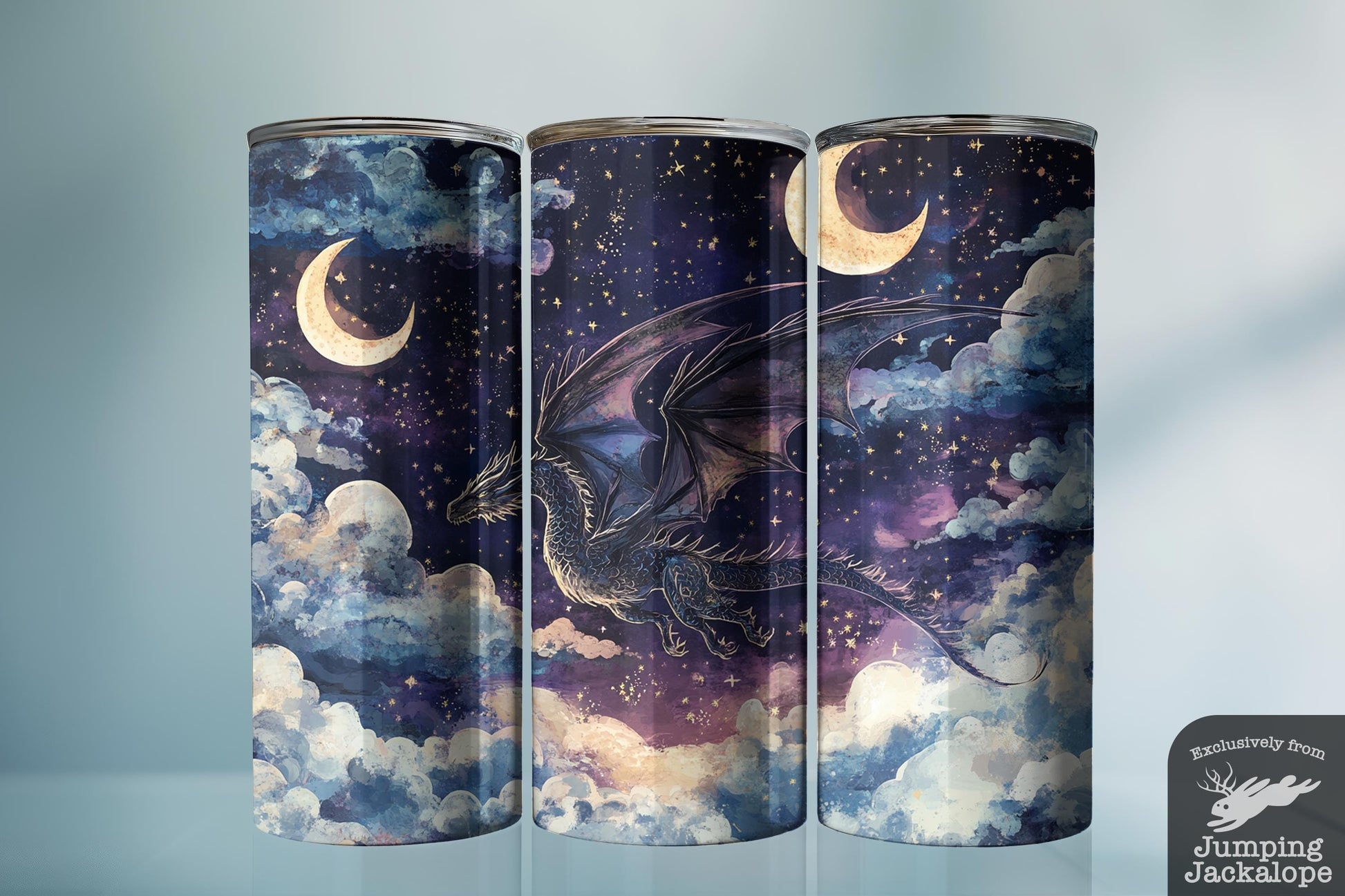 Glide through galaxies with this 20oz tumbler featuring a dark-winged dragon illuminated by nebula-like clouds and brilliant starbursts. Hues of violet, indigo, and moon-gold create a rich cosmic palette, while the delicate stars and flowing mist add movement and depth. A must-have for fantasy lovers, celestial dreamers, and those who prefer their dragons with a side of stardust.