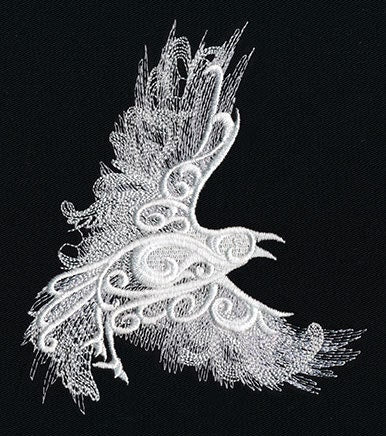 Layers of dimensional swirls, intricate lacy textures, and sheer painterly areas of stitching give this raven design an otherworldly edge