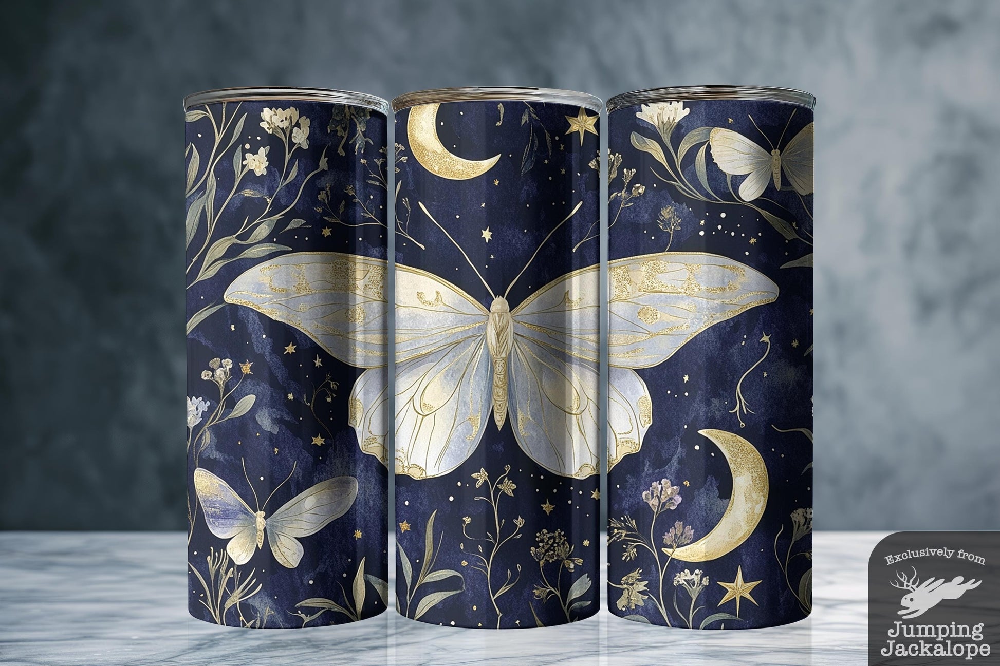 Gilded Whisper Moth Tumbler – Minimalist Gold Moth and Moons Travel Mug