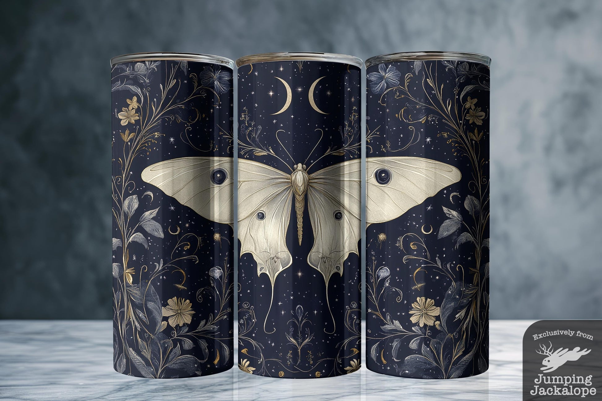 Golden Flight Moth Tumbler – Elegant Gold Moth and Moonlit Floral Mug