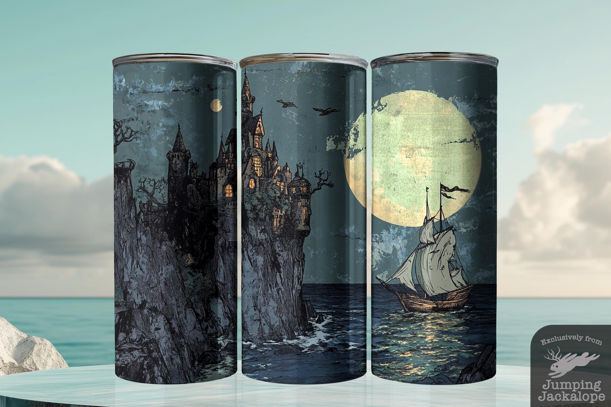 Gothic Castle by the Sea Tumbler – Moonlit Ship & Haunted Cliff Design