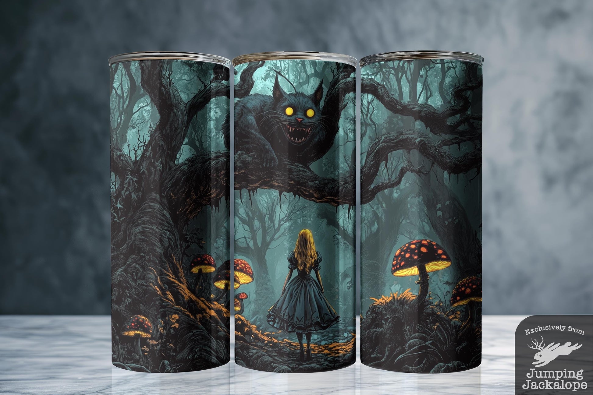 A forest of crooked trees. A floor of glowing toadstools. A girl and a grin. Alice stands alone, dwarfed by Wonderland’s wildness. The Cheshire Cat peers down with a smirk that knows every secret. Lush linework and gothic ambiance wrap around this tumbler like a tale passed down in whispers.