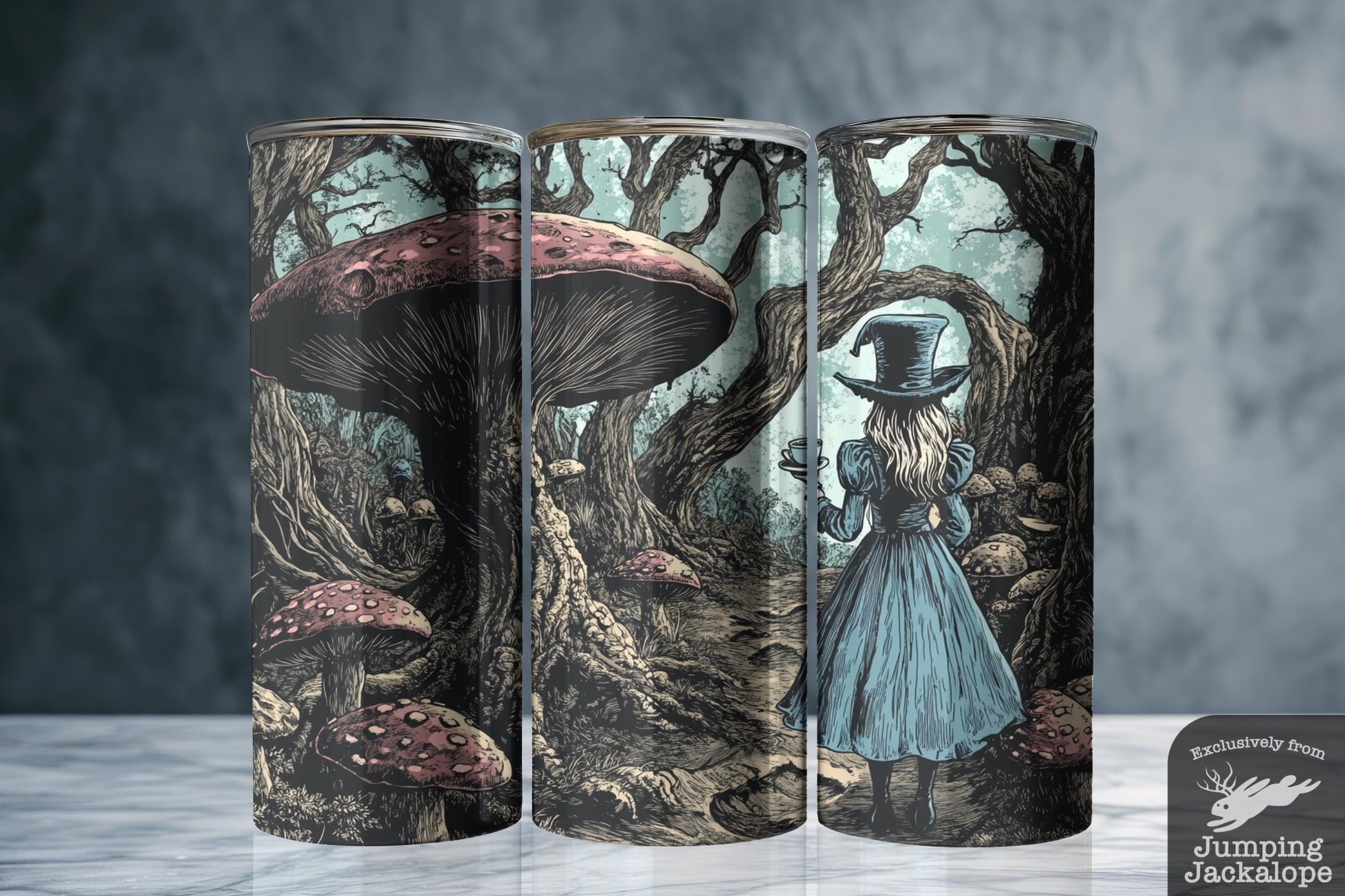 Gothic Wonderland Tumbler – 20oz Dark Mushroom Forest Scene | Sublimated Tea Cup with Lid & Straw | Personalized Alice Gift