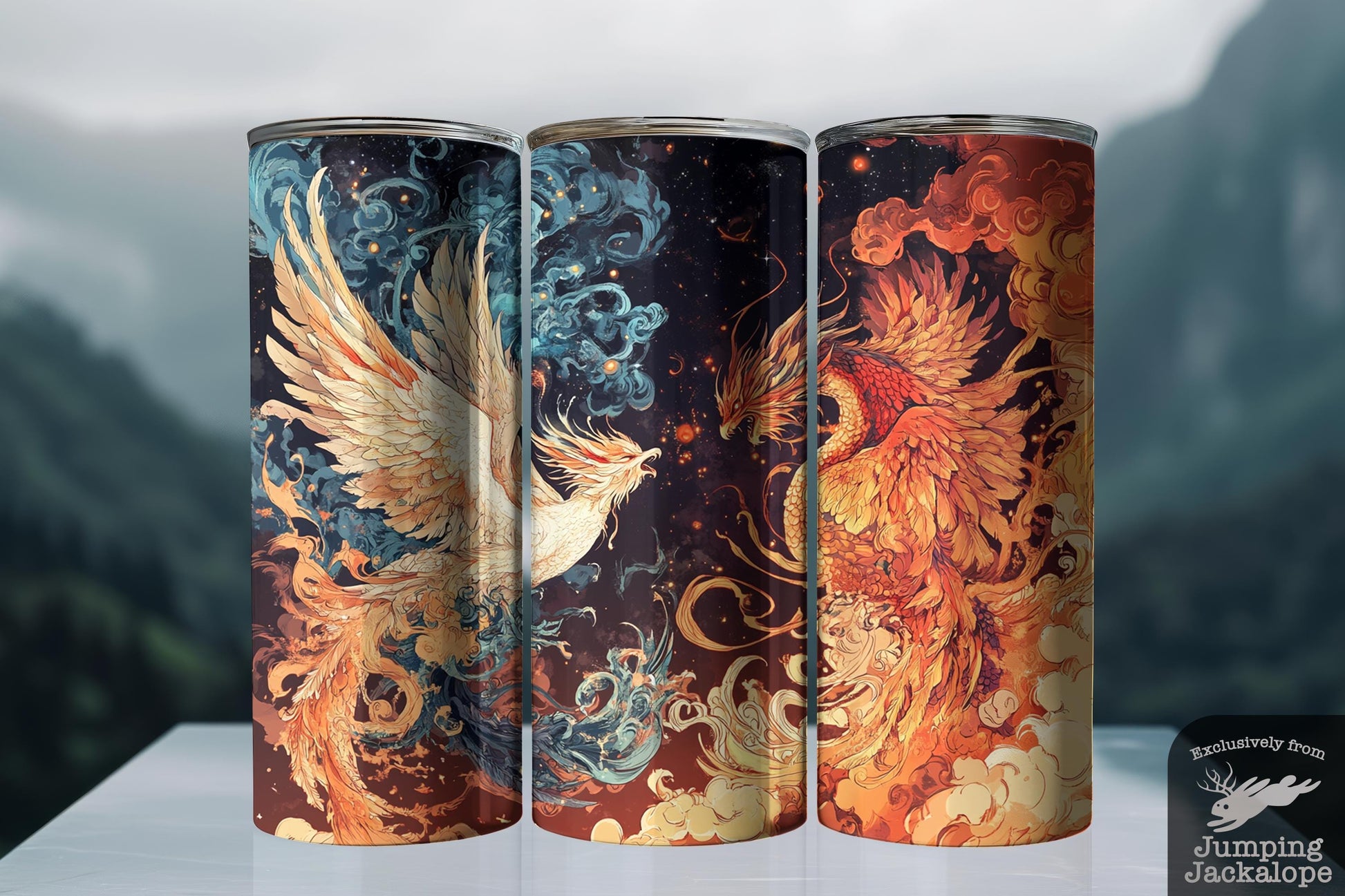 Heavenly Duel Tumbler – Phoenix & Dragon in Galactic Battle | 20oz Celestial Fantasy Cup