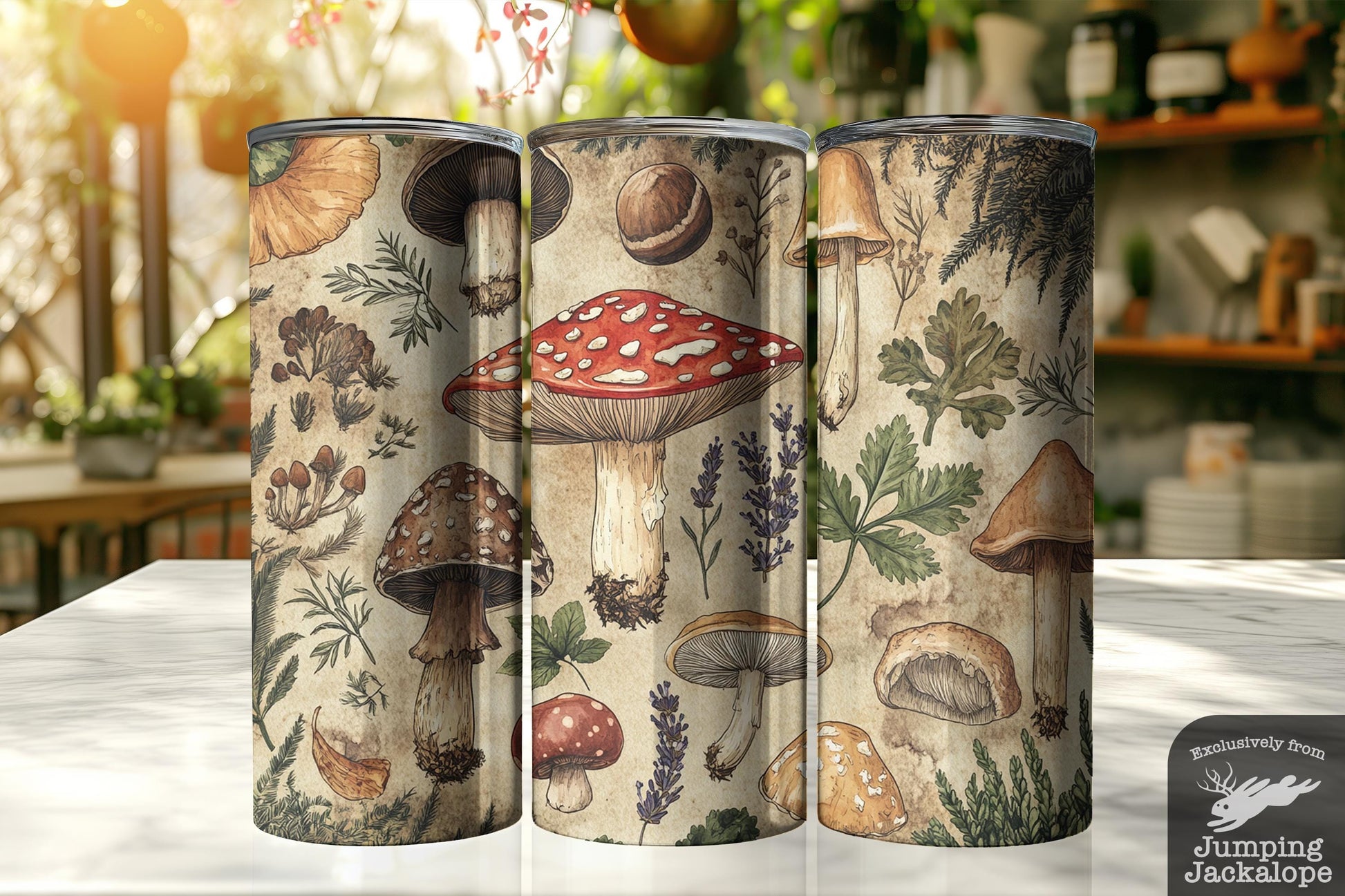 Illustrated Mushroom Tumbler – 20oz Black Ink Forest Fungi Print