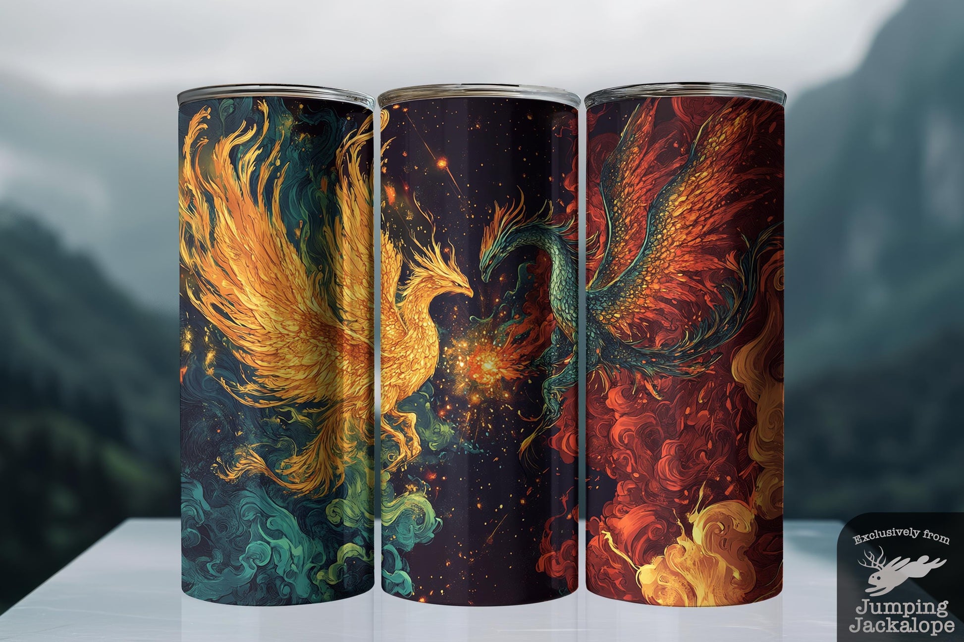 Inferno in the Stars Tumbler – 20oz Dragon and Phoenix Aerial Duel | Celestial Illustration Gift