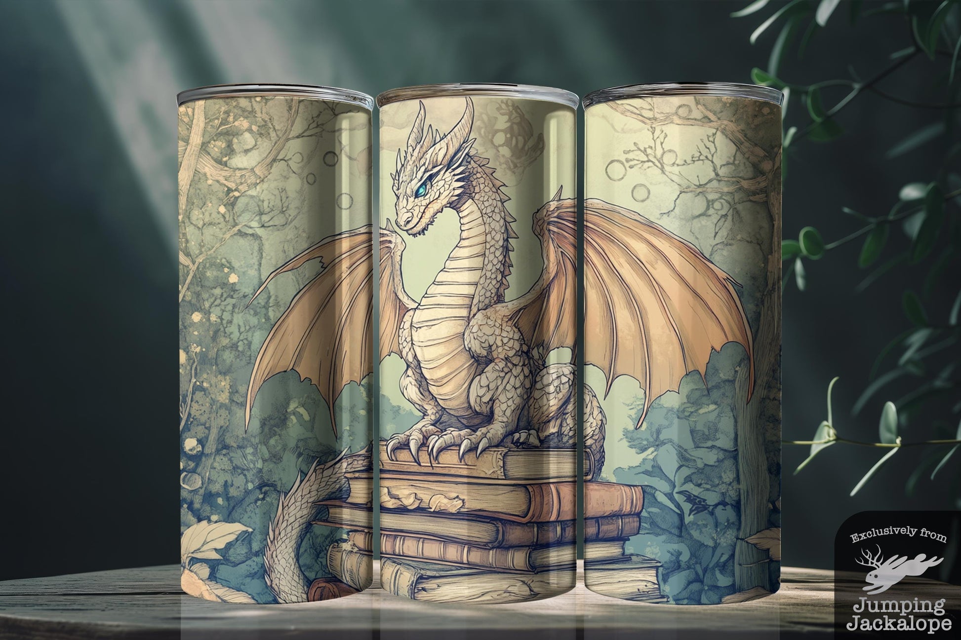A pale, pearlescent dragon with golden wings sits atop a stack of storybooks, nestled in a fairytale forest. This 20oz tumbler brings a soft, dreamlike palette and finely inked detail together, perfect for those who love fantasy stories with a hint of grace. A whimsical companion for your daily brew or evening tea.