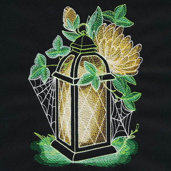 Lantern in this enchanted, summer garden embroidered on a canvas messenger bag.