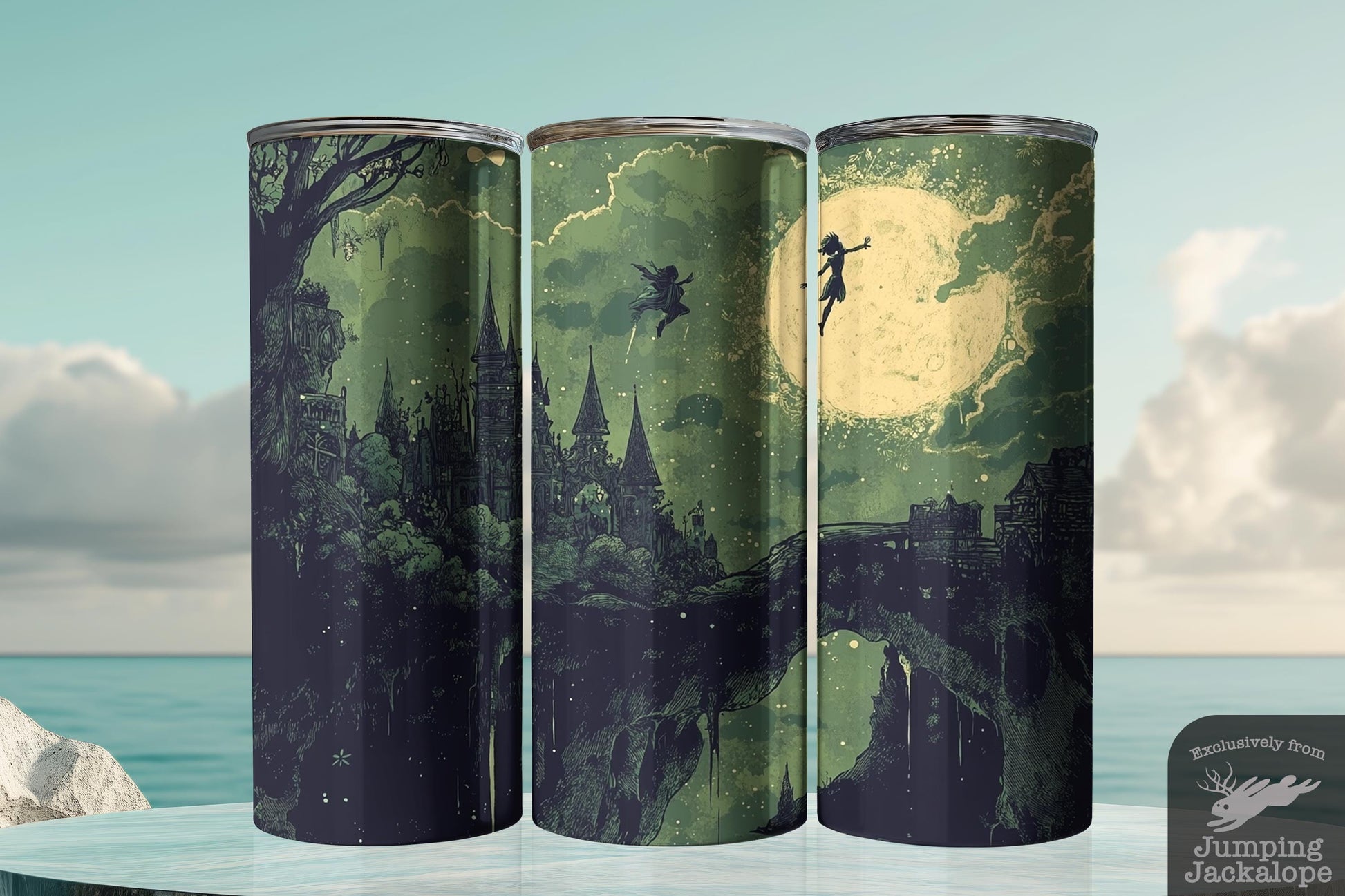 Lost in Thought Tumbler – Peter Pan Moon Scene | 20oz Gothic Fantasy Illustration Drinkware