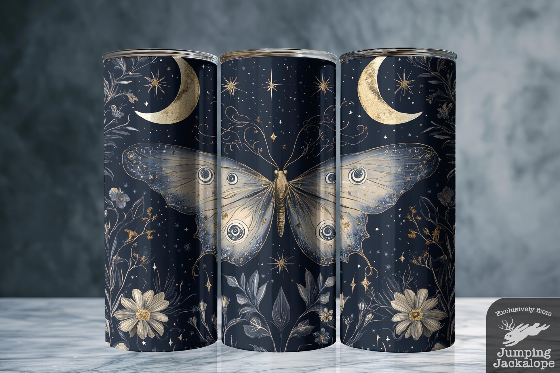 This serene 20oz tumbler features a glowing ivory moth framed by leafy scrollwork, golden florals, and moons rising against a velvety dark sky. A mix of celestial elegance and nature’s delicate touch, this design evokes quiet moonlit nights in a hidden woodland. A must-have for lovers of fairytales, stars, and timeless magic.