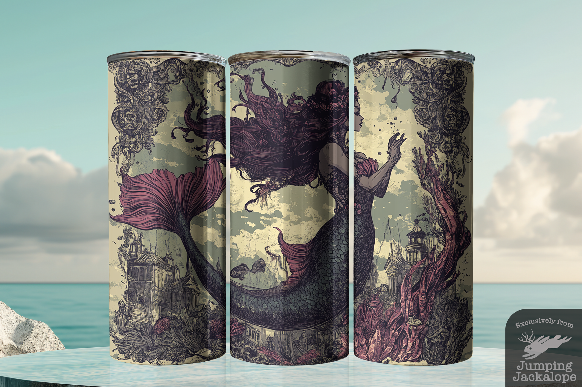Dive into a dark fairytale with this 20oz mermaid tumbler featuring a mysterious siren drifting through an ancient underwater city. Rich burgundy and deep teal hues give this design an old-world elegance, while gothic architectural ruins add an eerie beauty. Perfect for fans of dark fantasy, sea witches, and mythical sea lore.