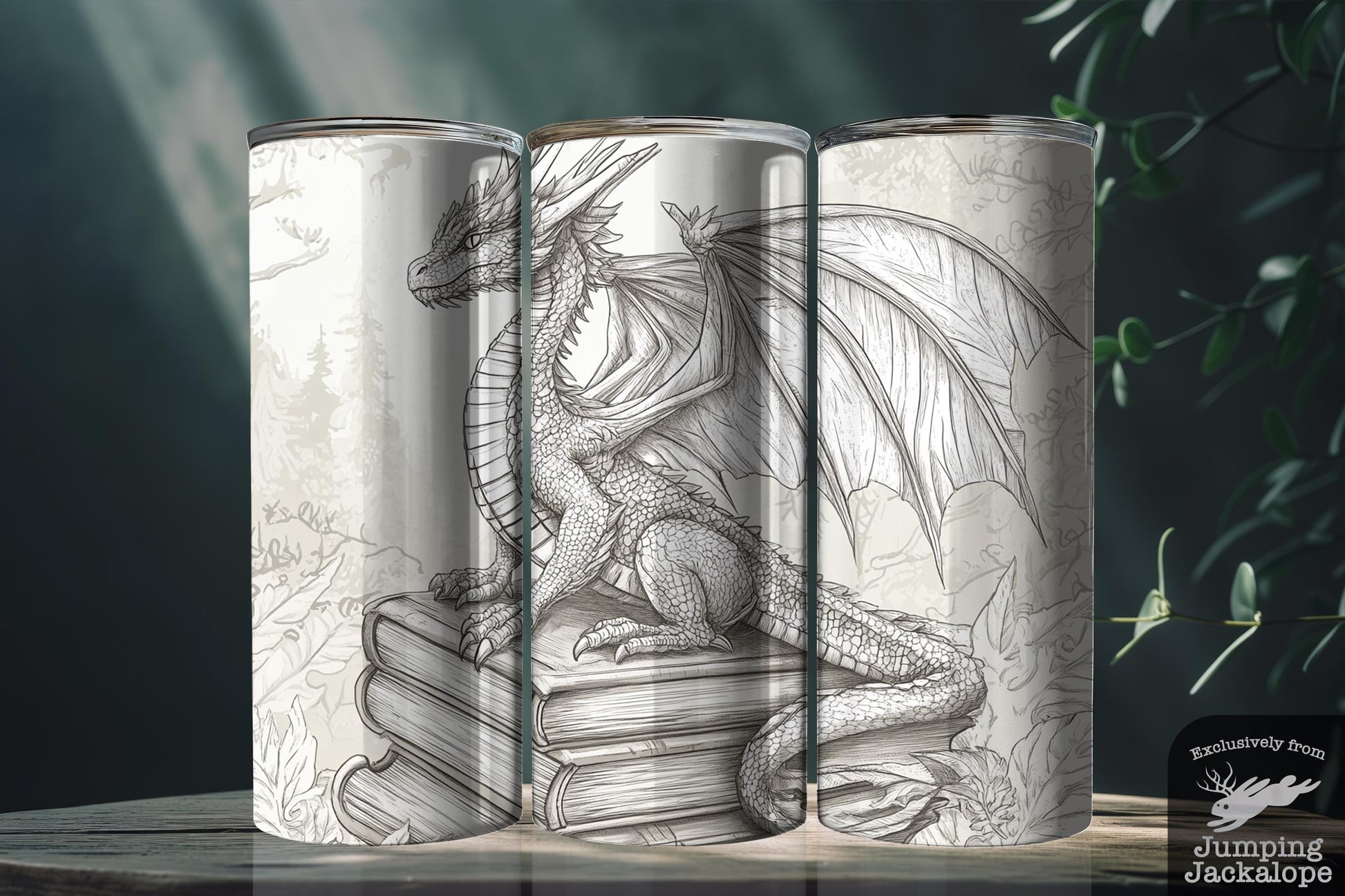 This elegant 20oz tumbler features a stunning hand-drawn dragon perched on a pile of ancient tomes, wings curled in protective grace. Rendered in detailed black-and-white line art, it’s a design that evokes the feel of old-world scrolls and forgotten legends. A must-have for art lovers, fantasy fans, or those who admire the quiet power of dragons and ink.