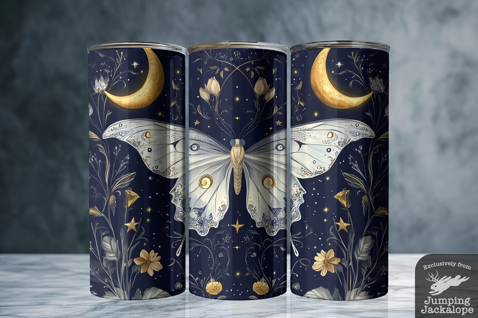 Moonlit Lace Moth Tumbler – Whimsical Floral Night Sky Travel Cup