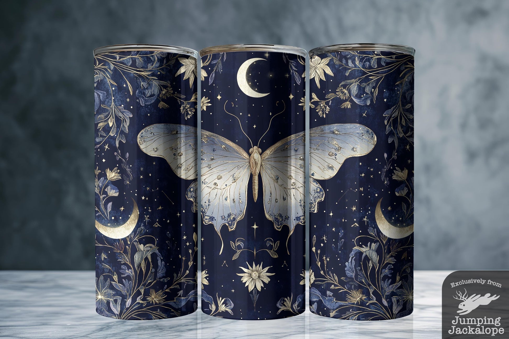 Moonshadow Grace Moth Tumbler – Ethereal Moth & Crescent Moon Night Cup