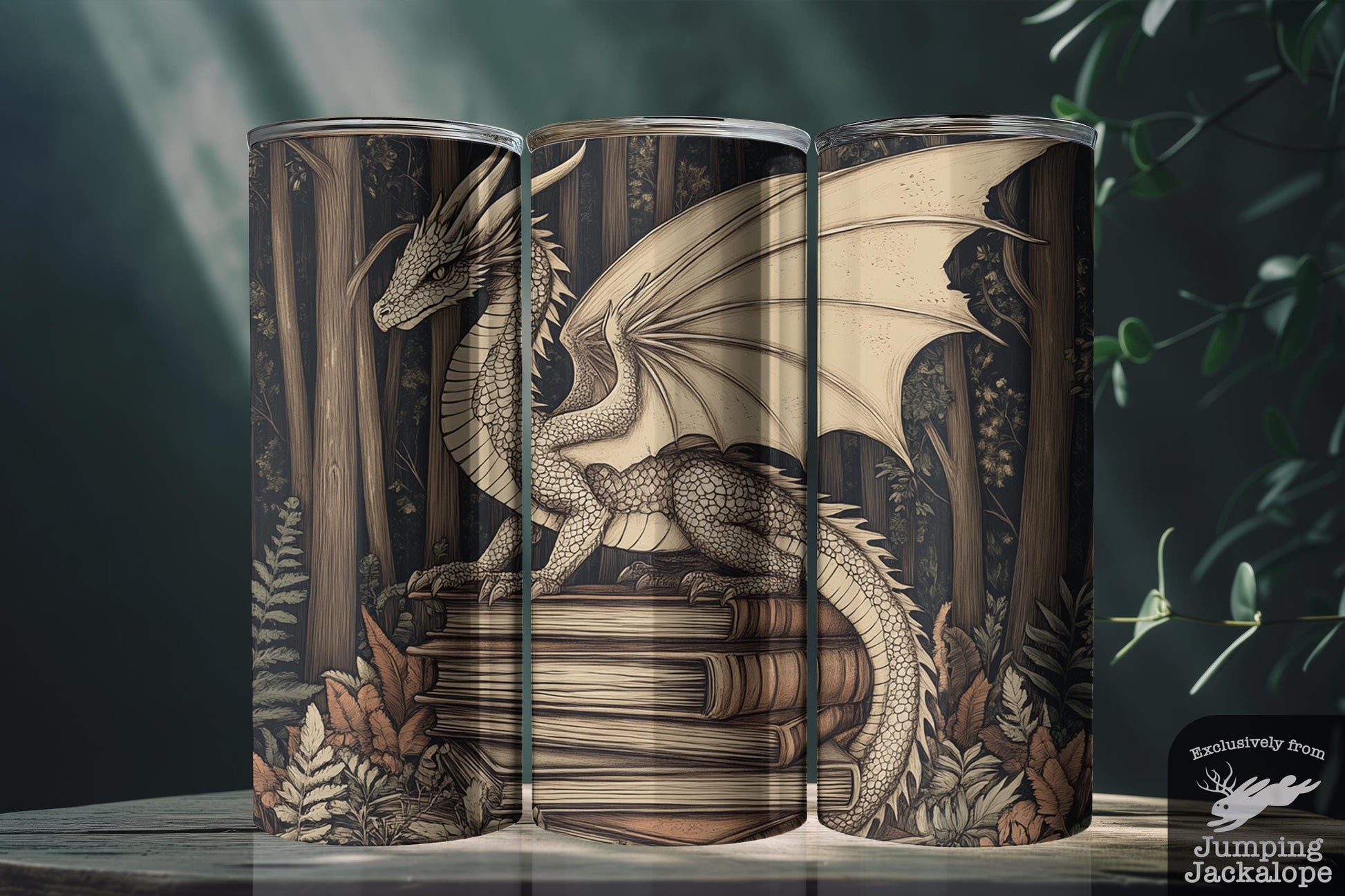 Mystical Forest Dragon Tumbler – 20oz Cream-Winged Serpent on Books | Enchanted Woodland Fantasy Drinkware
