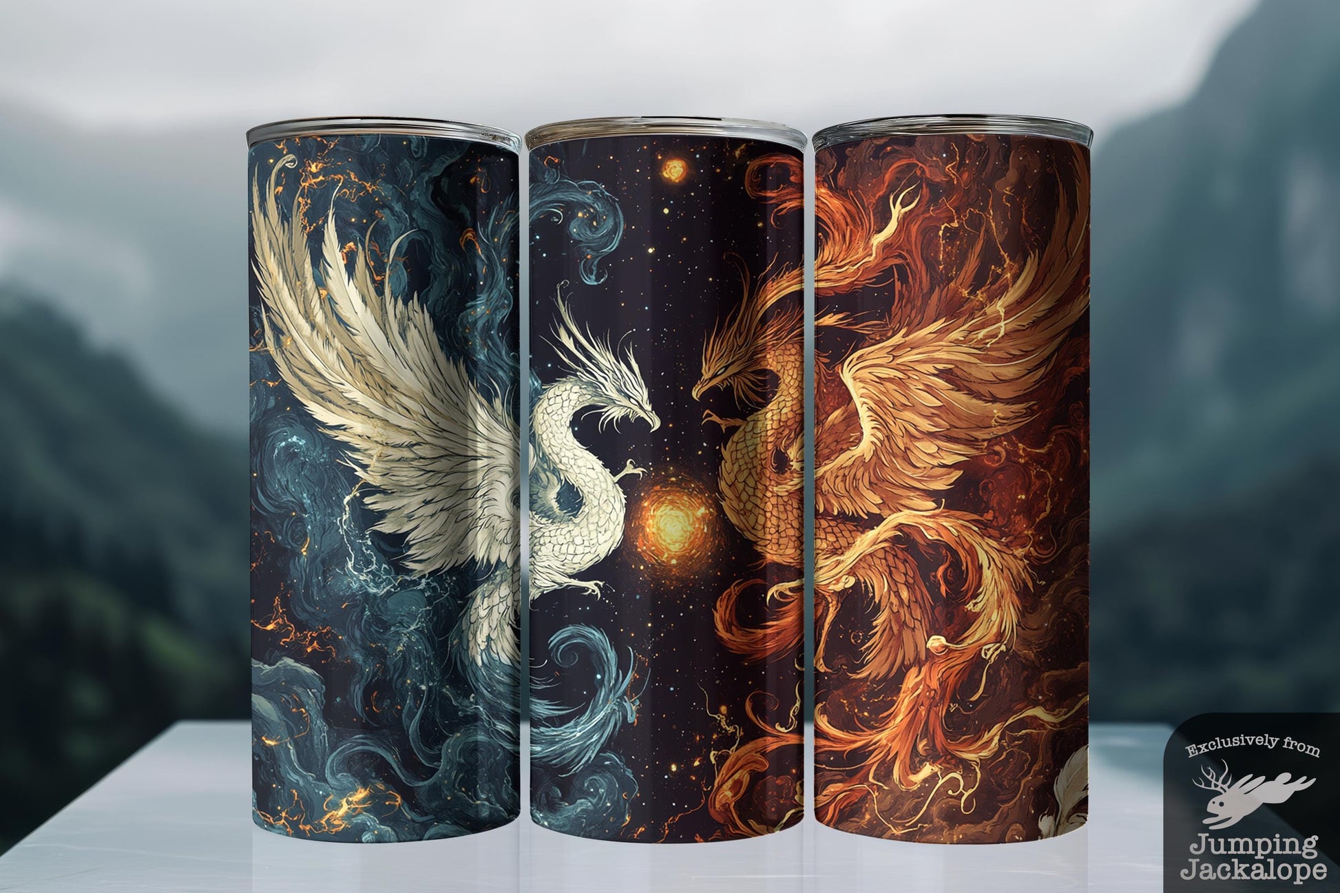 Mythical Fire & Sky Tumbler – 20oz Phoenix vs. Dragon Art | Cosmic Fantasy Battle Cup