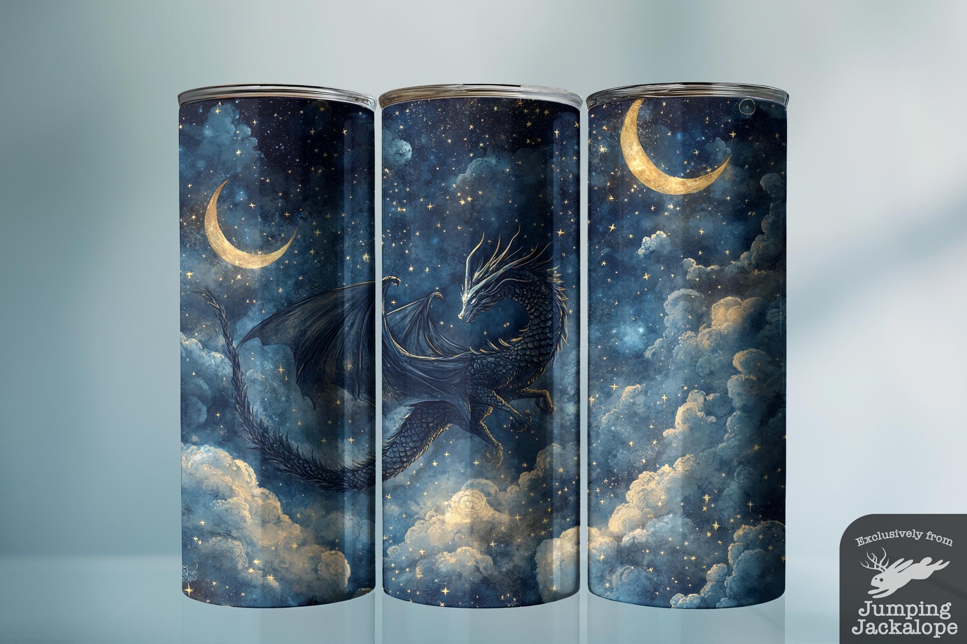 This design features a majestic dragon mid-glide through a sea of blue and gold. Framed by starlit clouds and celestial shimmer, this 20oz tumbler feels like holding a fantasy realm in your hands.
