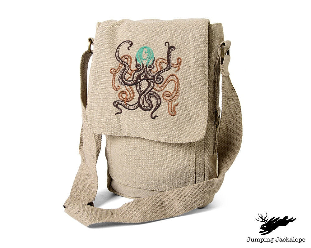 Sea Treasure - Octopus, Octopus Bag, Octopus Embroidered Canvas Tech, Tablet, iPad, Kindle, Fire, Camera Bag