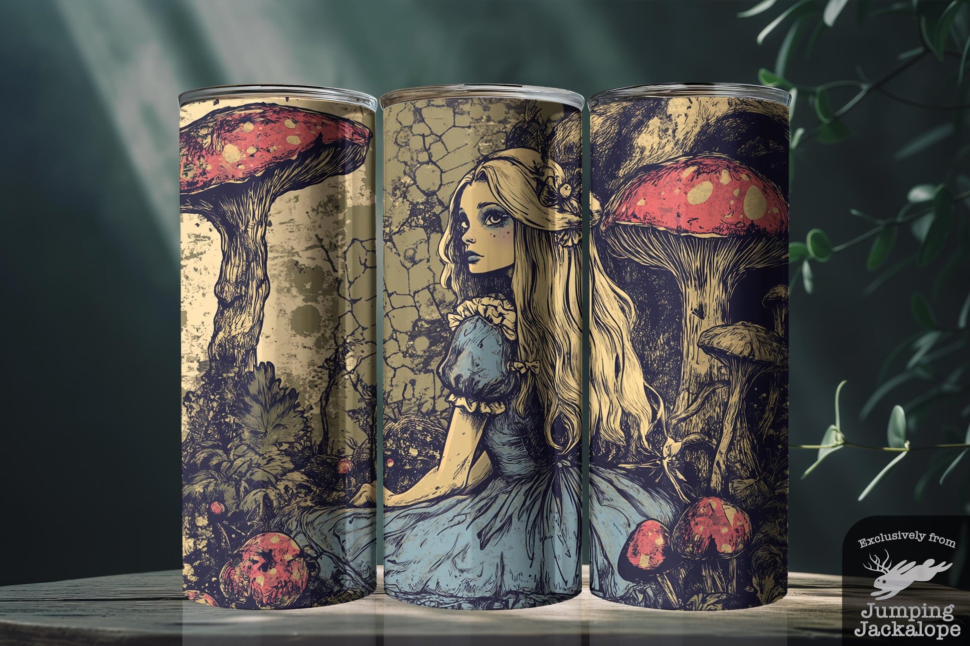 Enter a darker version of Wonderland with this exclusive 20oz sublimated tumbler from Jumping Jackalope. Alice wanders through a brooding forest floor blanketed in oversized, twisted mushrooms, her expression lost somewhere between wonder and dread. With intricate linework, moody vintage hues, and a surreal, shadowed atmosphere, this design captures the haunting whimsy of a dream just on the edge of a nightmare.