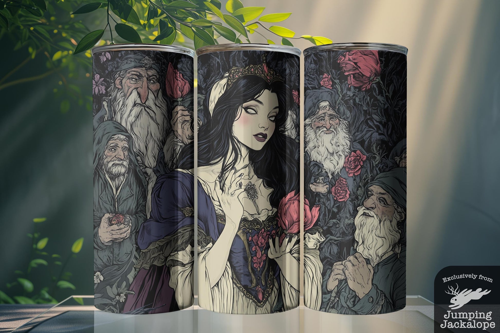 Snow White Gothic Fairytale Tumbler – 20oz Dark Fantasy Art with Seven Dwarves | Whimsical Drinkware