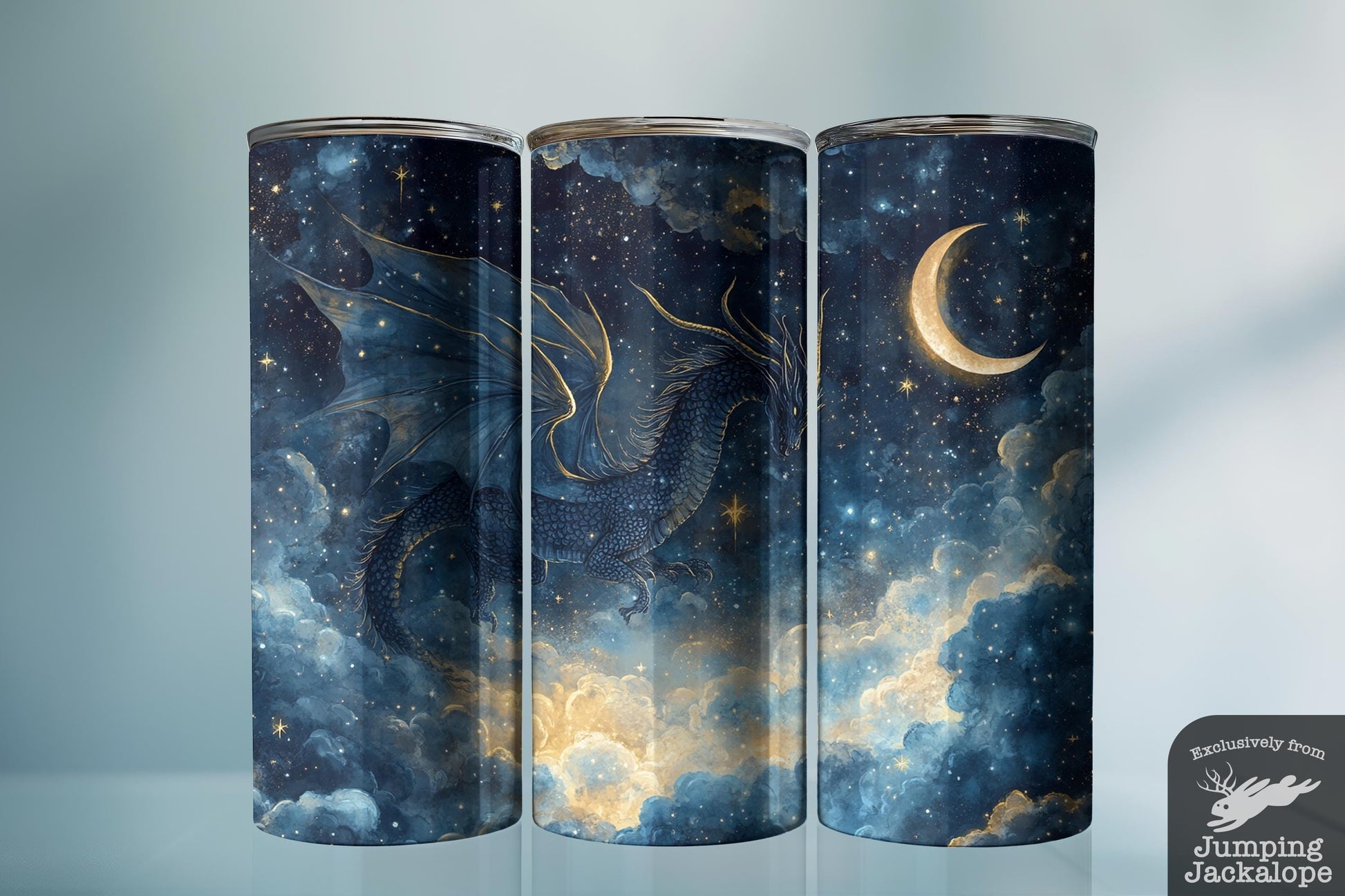 Starborne Flight Dragon Tumbler – 20oz Fantasy Moonlit Sky Art | Celestial Night Drinkware