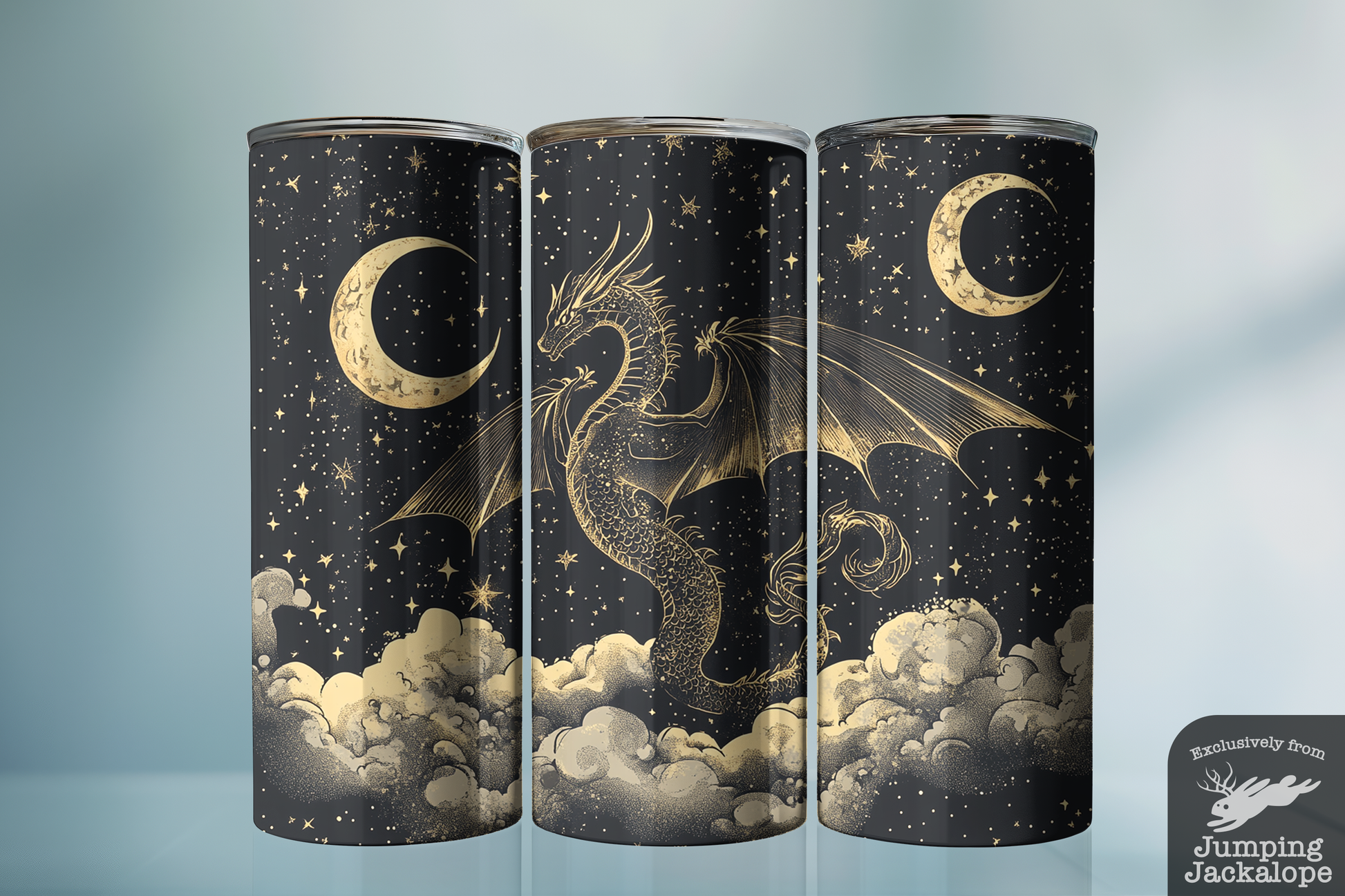 A golden dragon soars beneath crescent moons in this elegant 20oz tumbler, illustrated in fine linework over a velvety black sky. Surrounded by constellations and shimmering clouds, this design evokes celestial grandeur with a touch of mythological mystique. Perfect for fans of dark fantasy and cosmic legend.