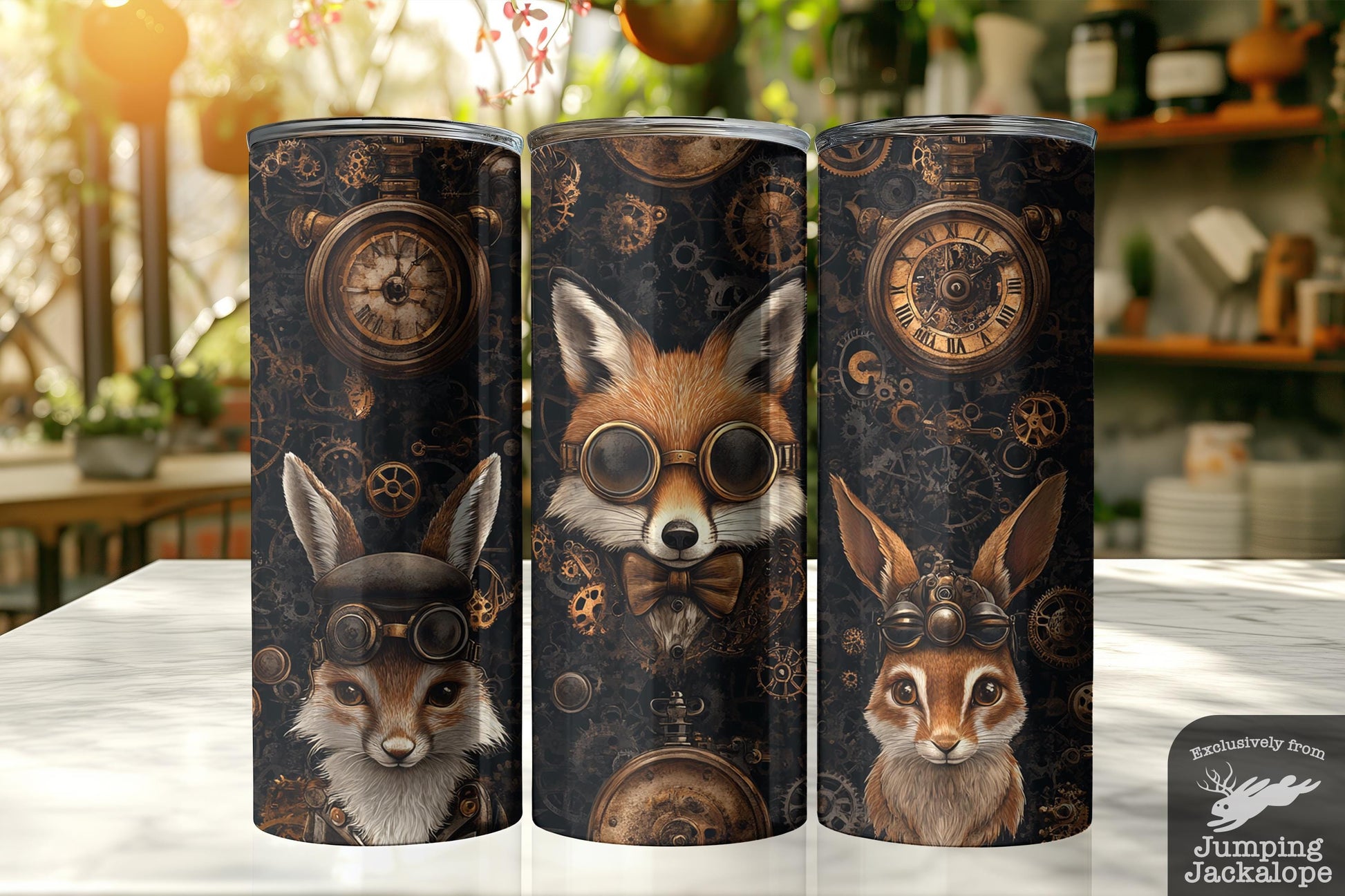 Steampunk Time Traveler Animal Tumbler – 20oz Fox and Bunny with Gears & Goggles | Fantasy Clockwork Design