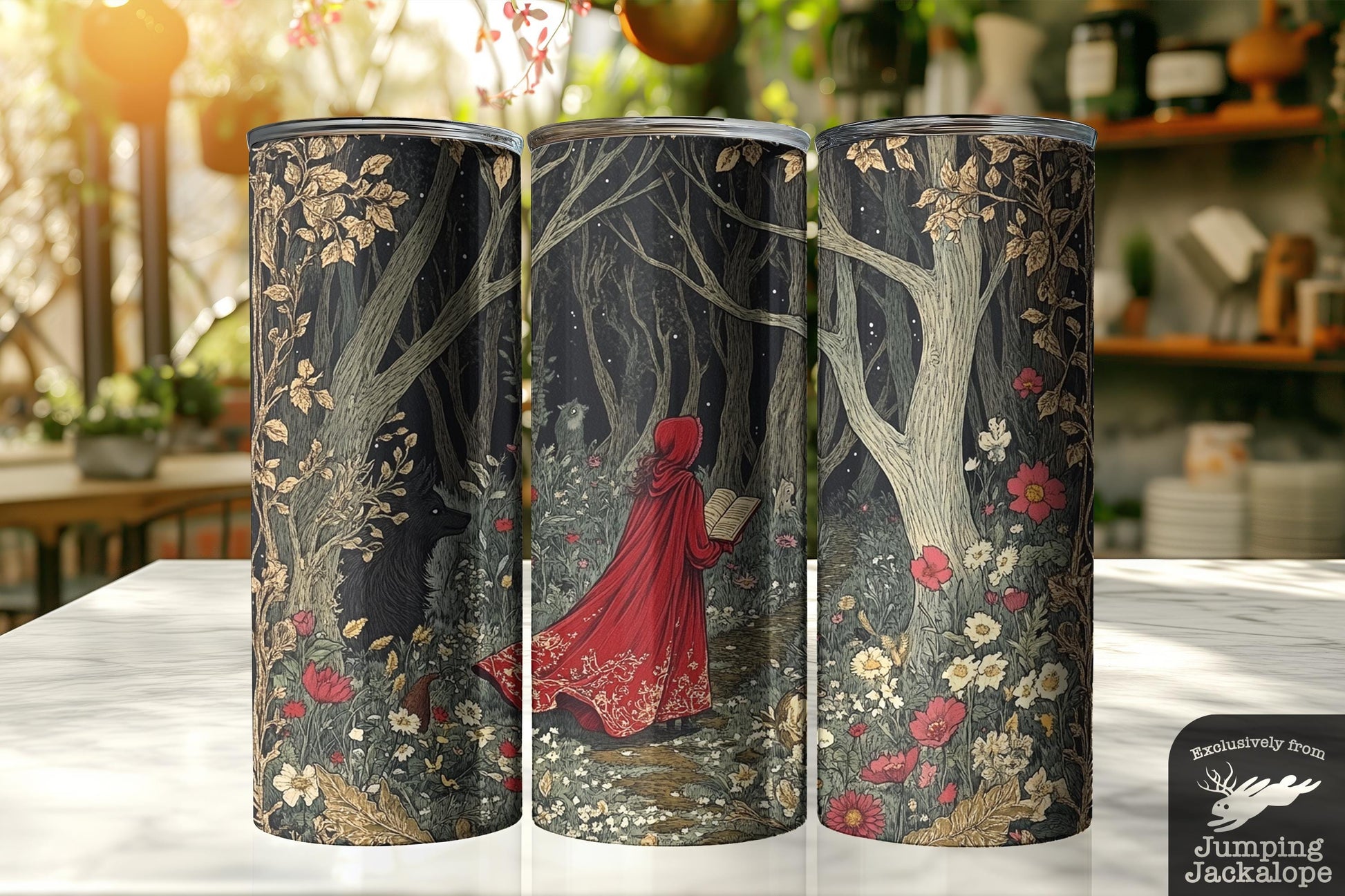 This 20oz tumbler feels like a page from an ancient, embroidered tale. Red Riding Hood strolls through a darkened forest, book in hand, as golden leaves shimmer and a shadowed wolf lurks among the trees. A bewitching blend of gothic elegance and cozy folklore—ideal for dark fairytale collectors.