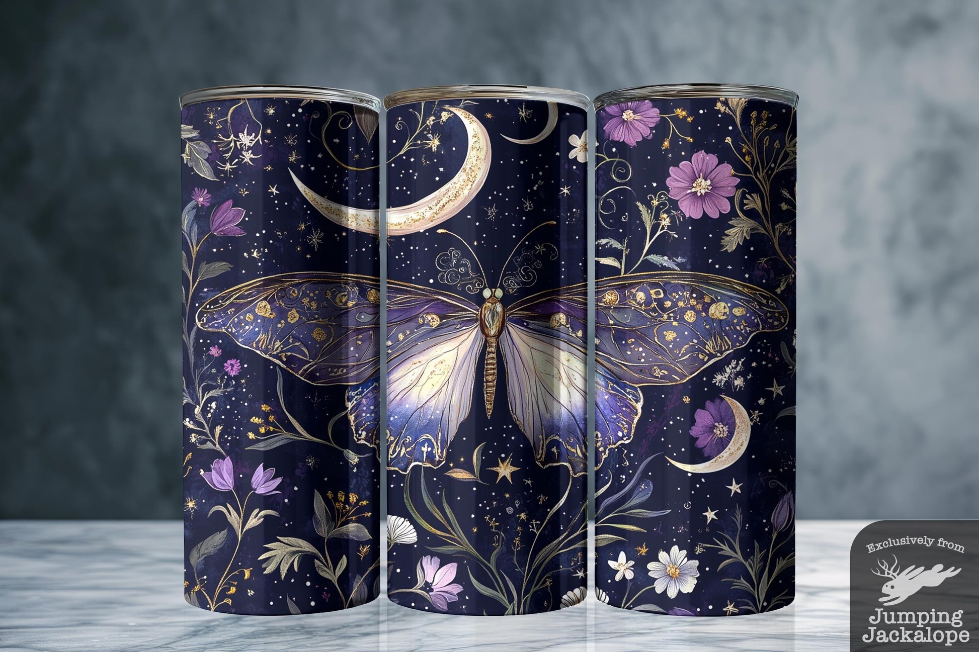 Radiating rich purple and deep gold, this whimsical tumbler features a glowing moth with lavender-tinged wings, surrounded by flowers and swirling moons. A standout piece that blends fairytale whimsy with a touch of stardust drama.