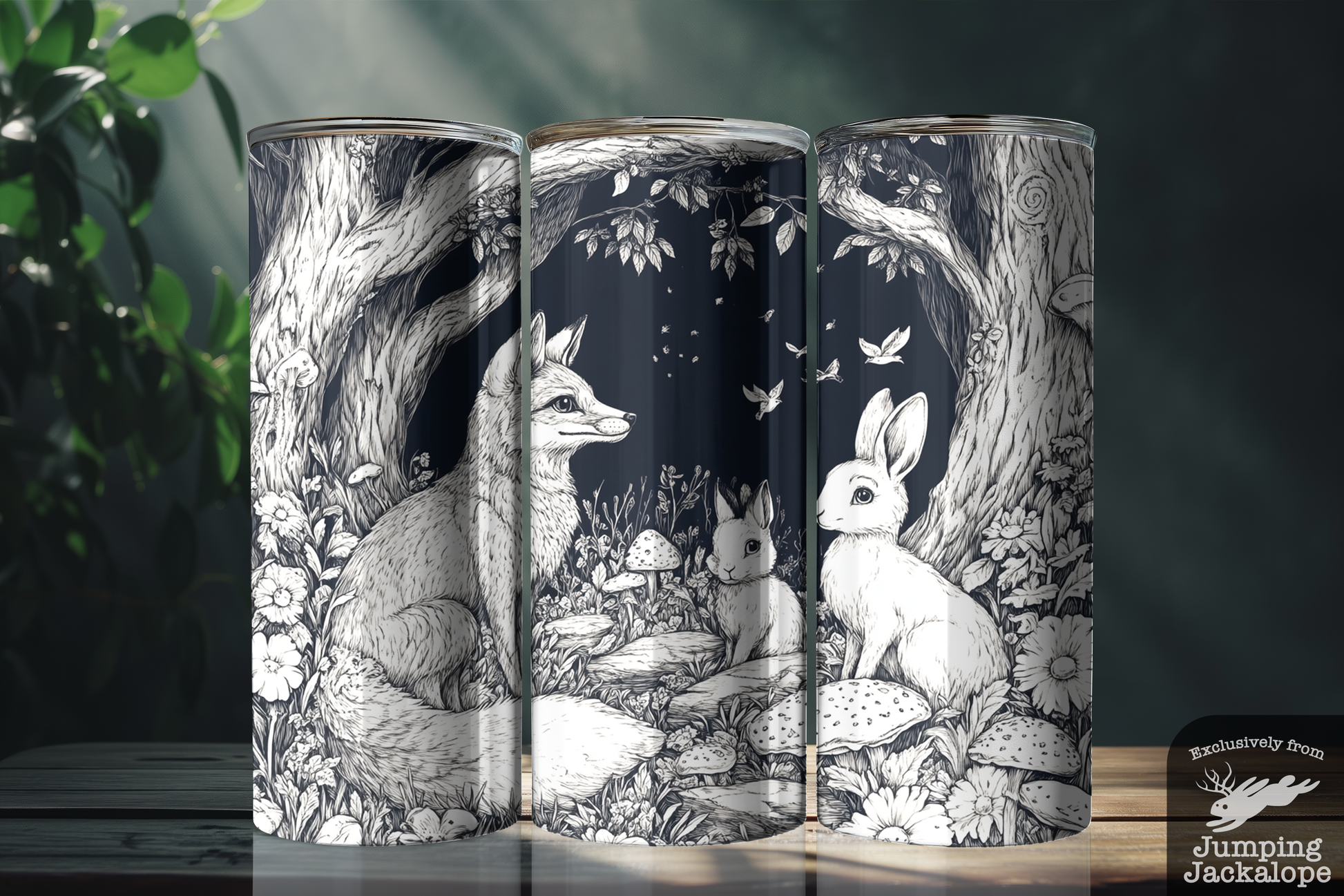 Bring a dreamlike touch to your daily routine with this black and white 20oz tumbler adorned with a fox, bunny, and delicate flora beneath sweeping tree branches. This elegant design captures the stillness of twilight in a magical forest, ideal for those who crave simplicity and serenity in their drinkware.
