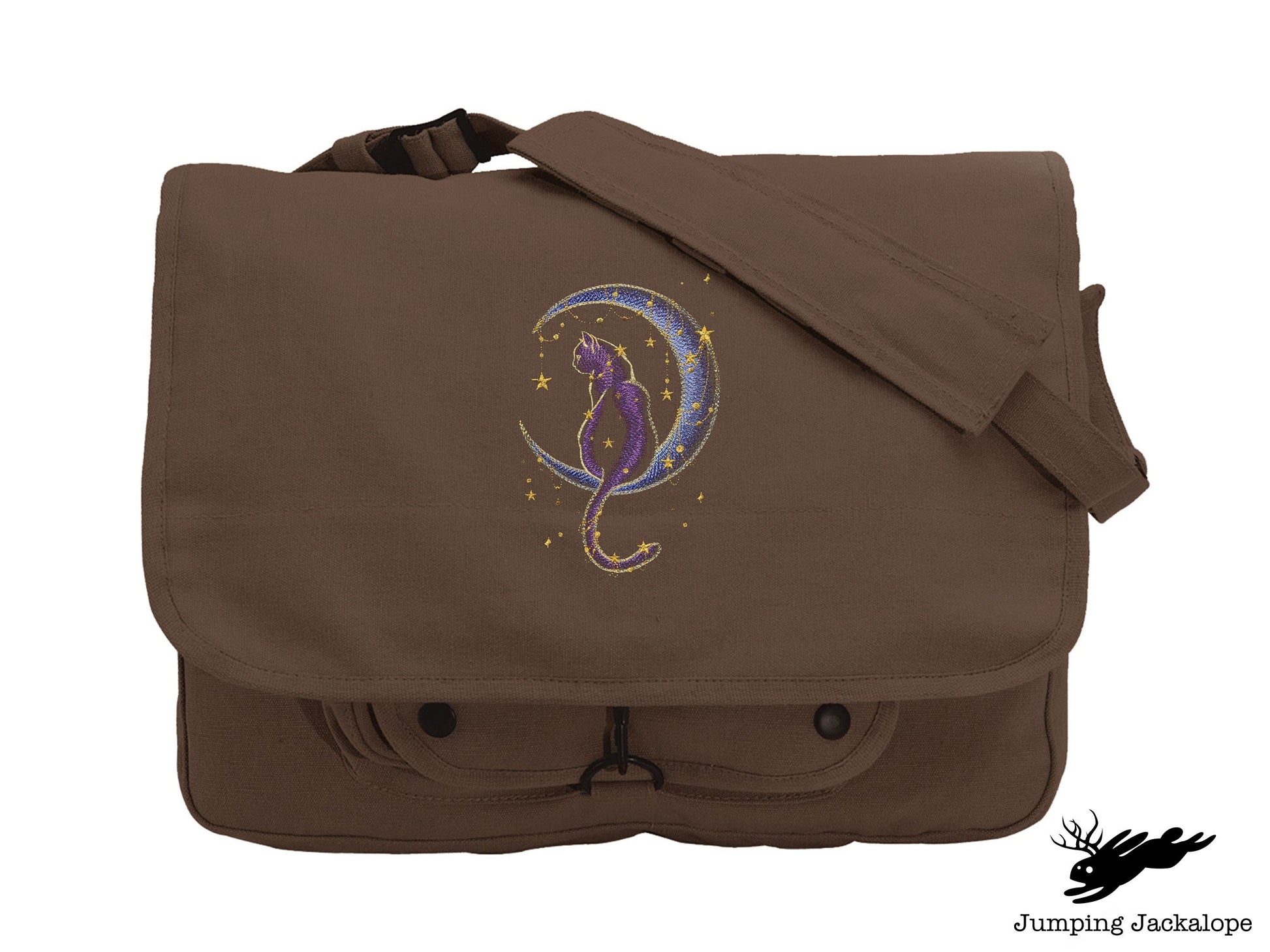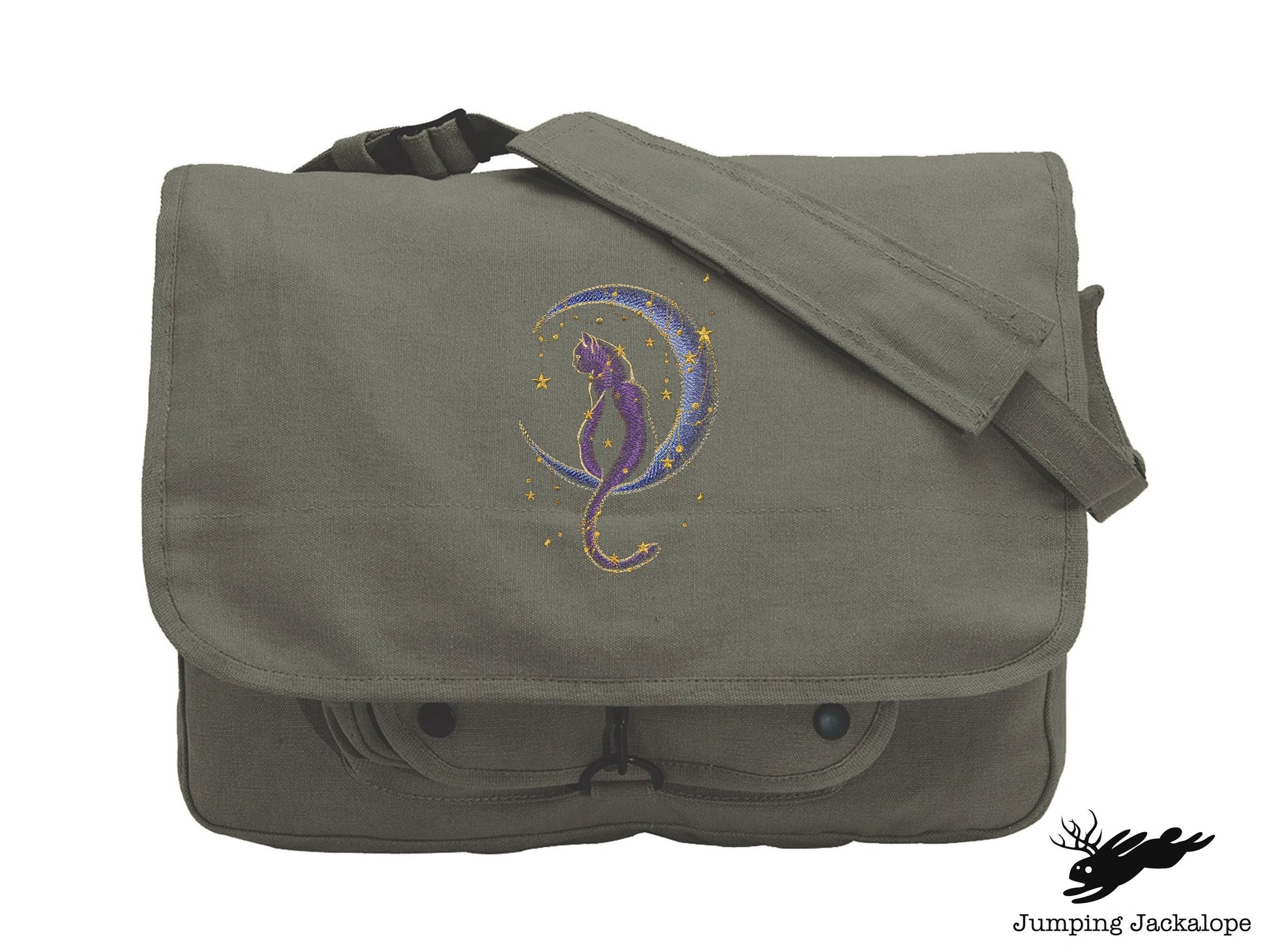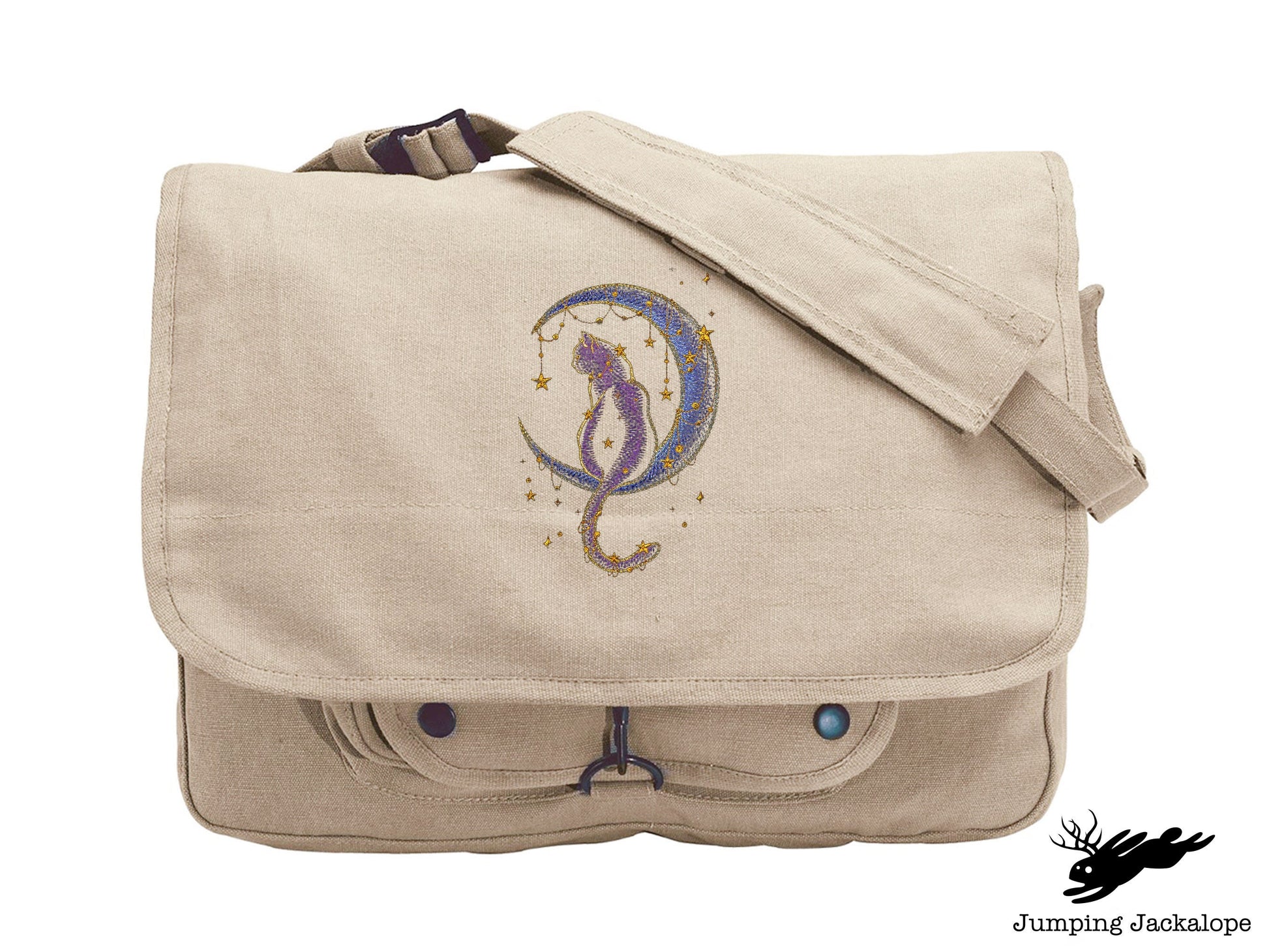 Join this kitty and make a wish upon the stars. Cat design embroidered on a canvas messenger bag.