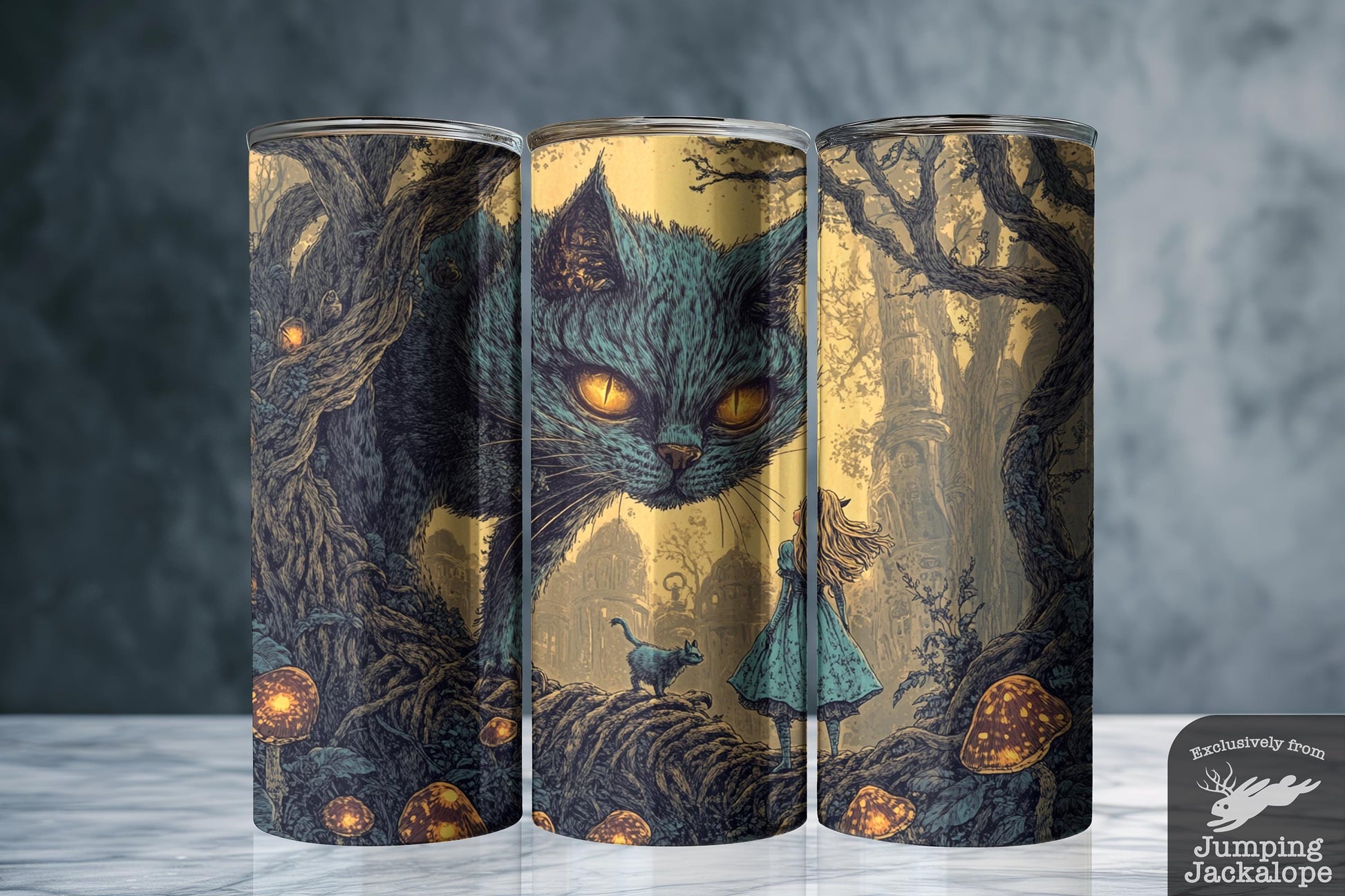 In the dim light of a mushroom-lit forest, Alice isn't sure if she's dreaming—or being dreamed of. Eyes linger in the shadows. And the widest smile belongs to the creature overhead. Rendered with the dark grace of vintage illustration, this tumbler invites you into a tale with no clear way out.