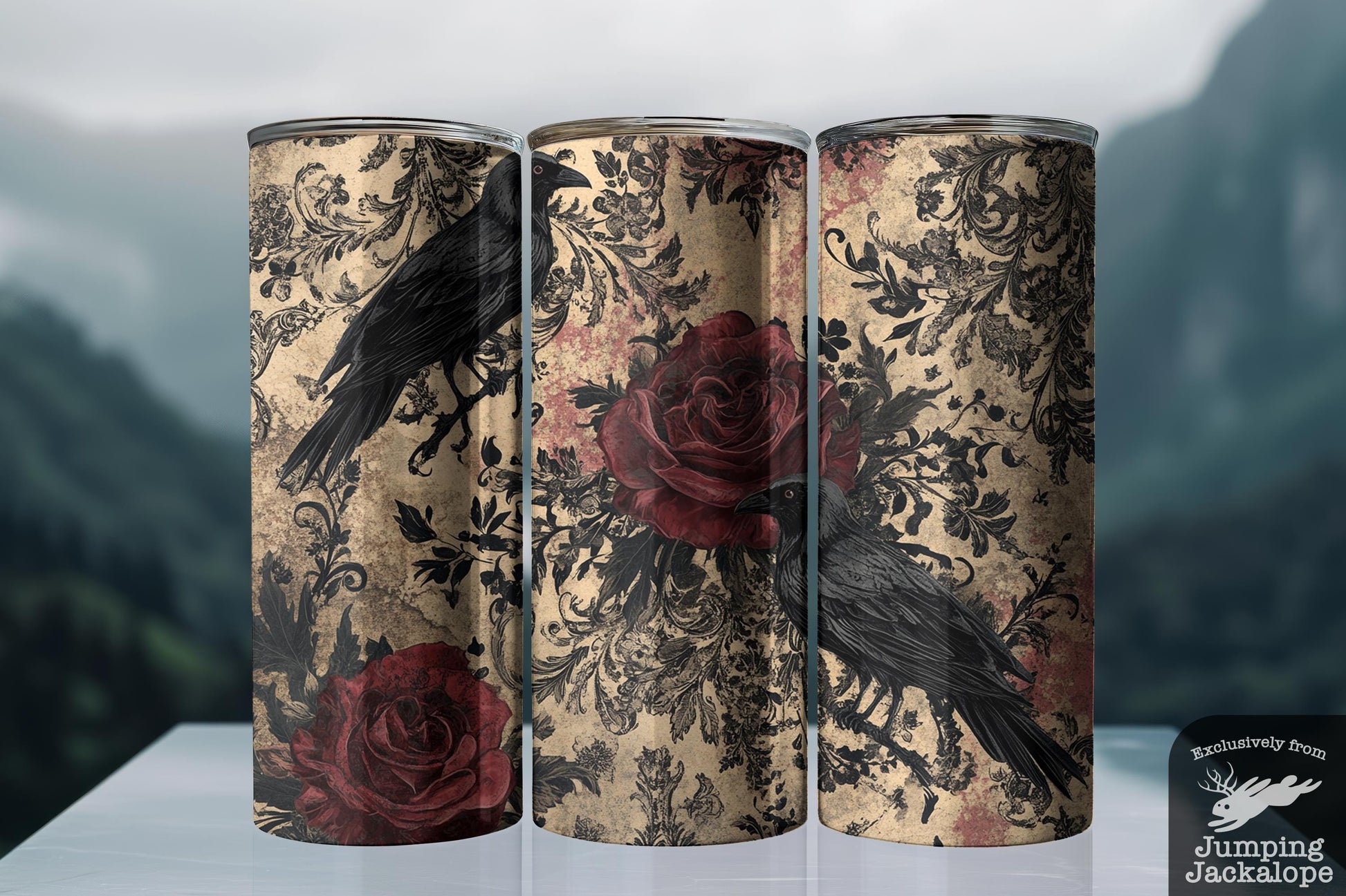 Victorian Gothic Raven Tumbler – 20oz Skull, Red Roses & Crow Cup | Macabre Aesthetic Drinkware