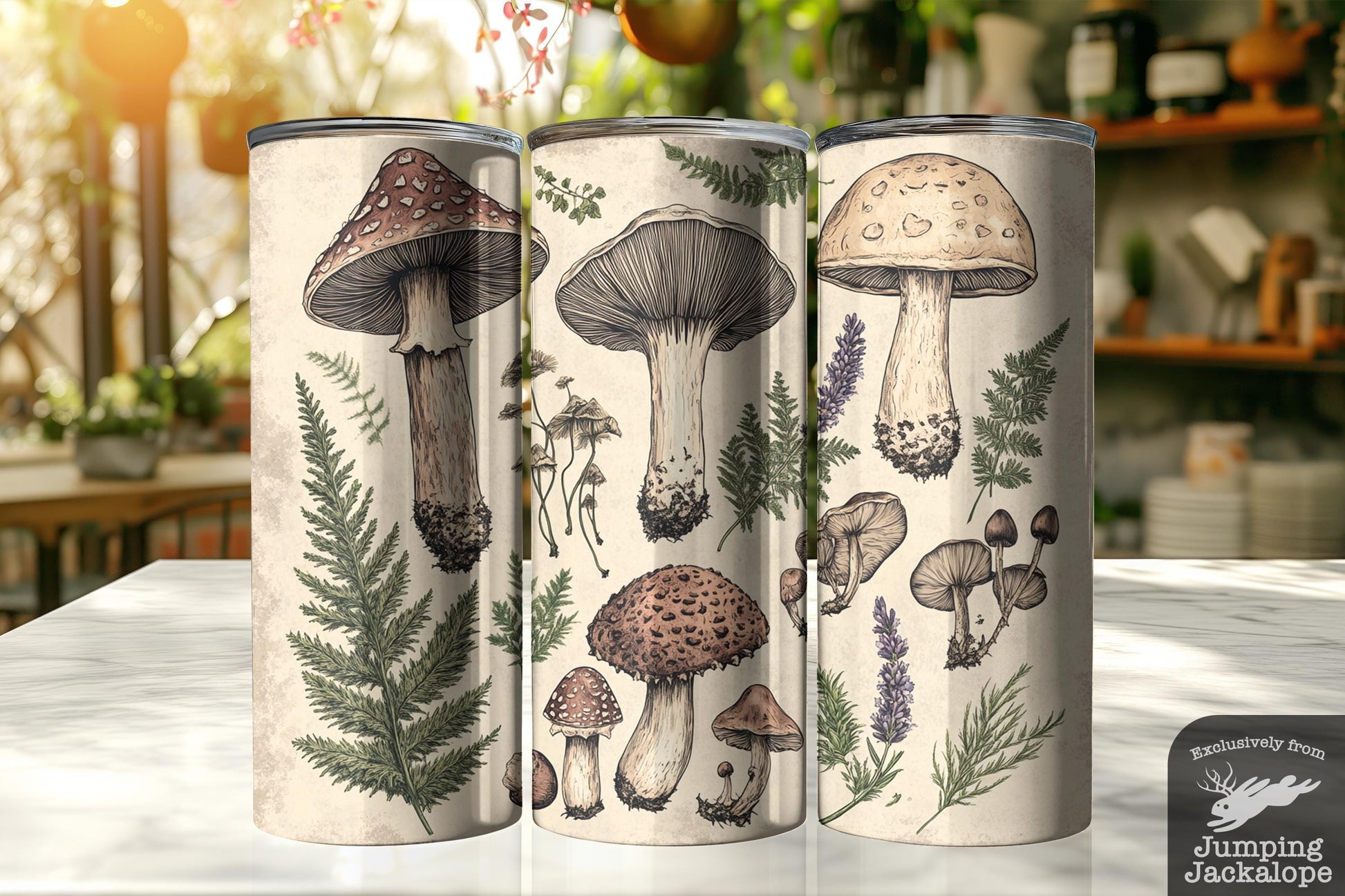 Vintage Botanical Mushroom Tumbler – 20oz Black & White Forest Sketch