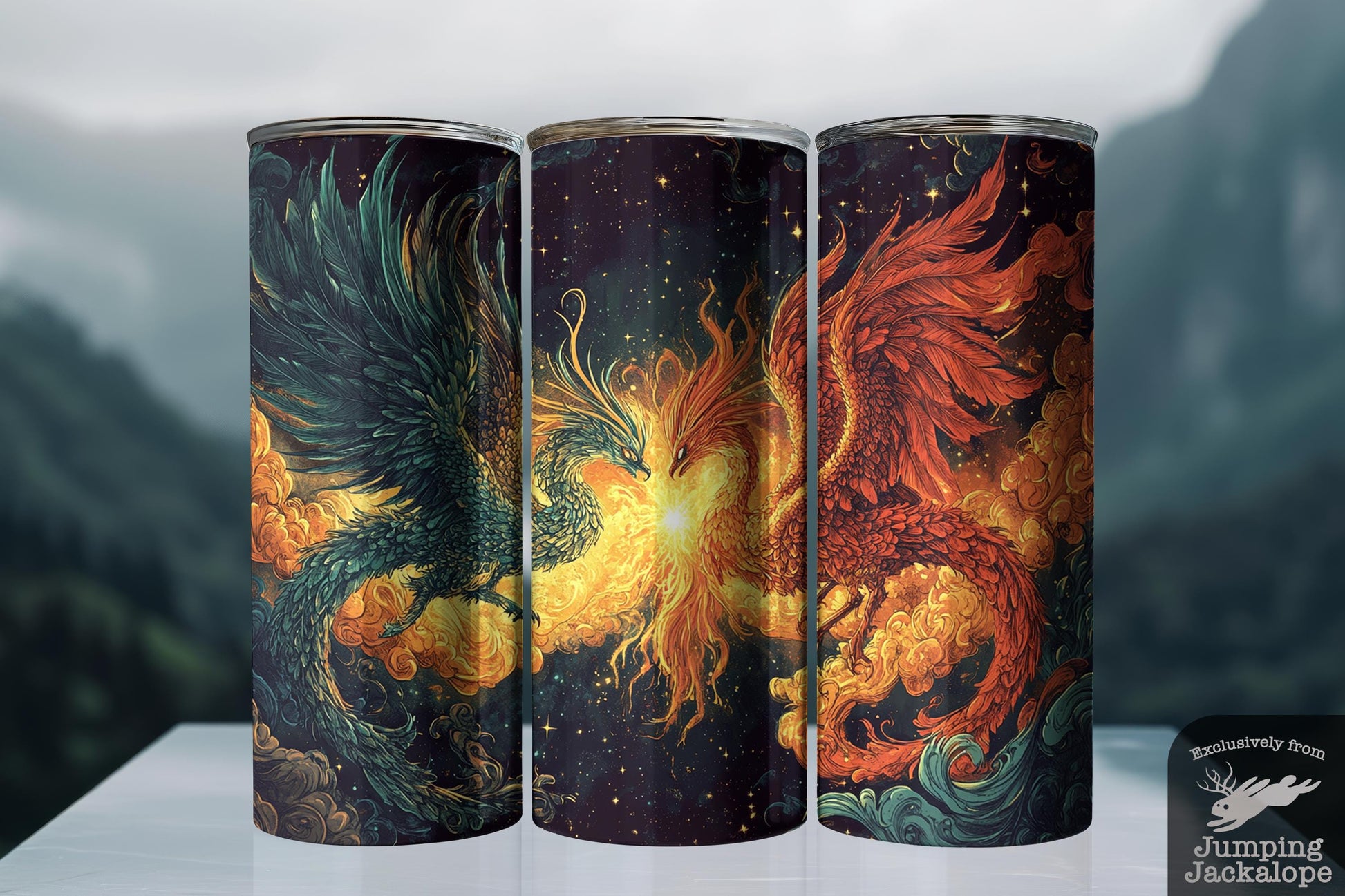 Wings of Fire Tumbler – 20oz Phoenix and Dragon Celestial Battle | Mythical Fantasy Scene